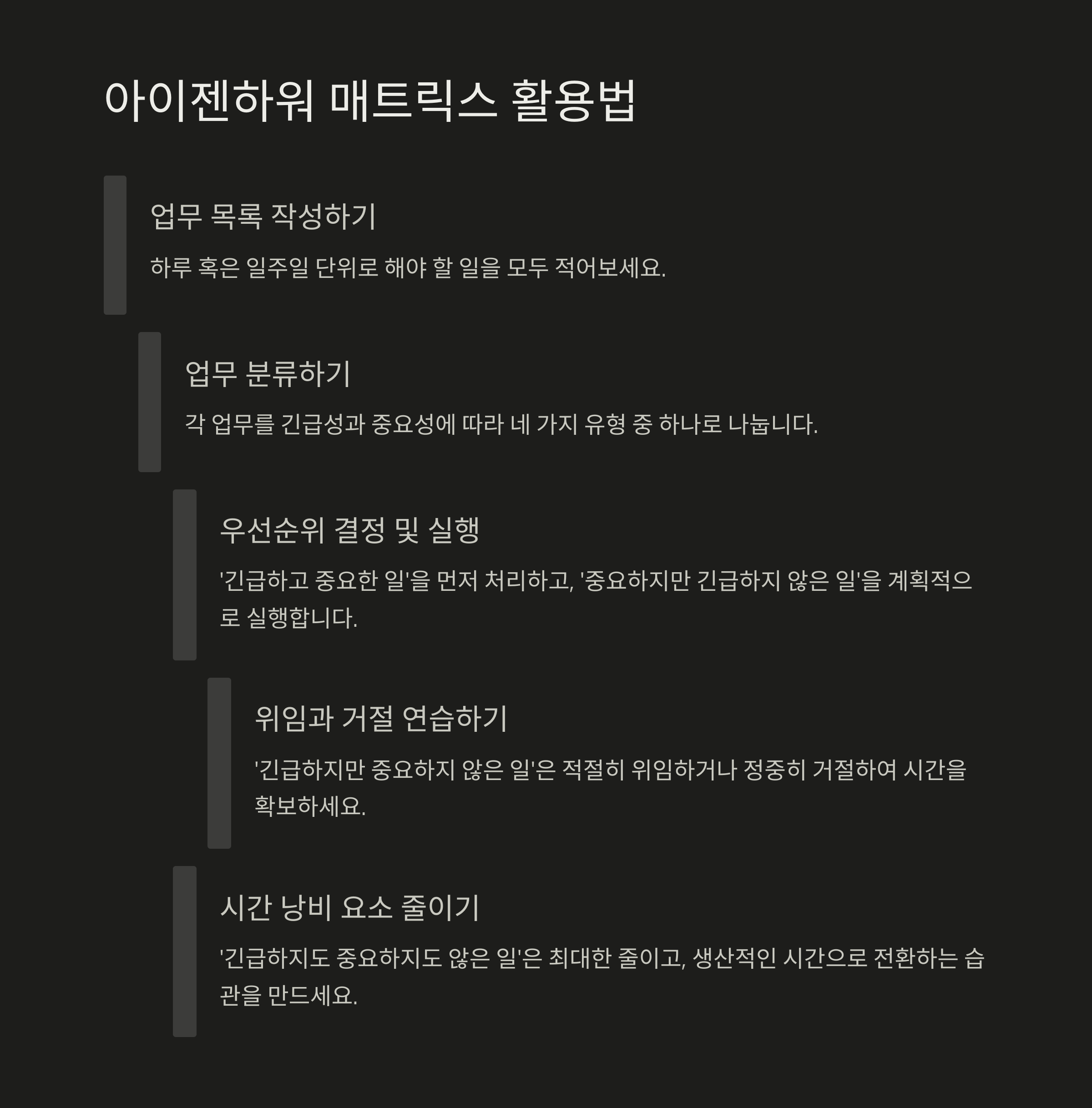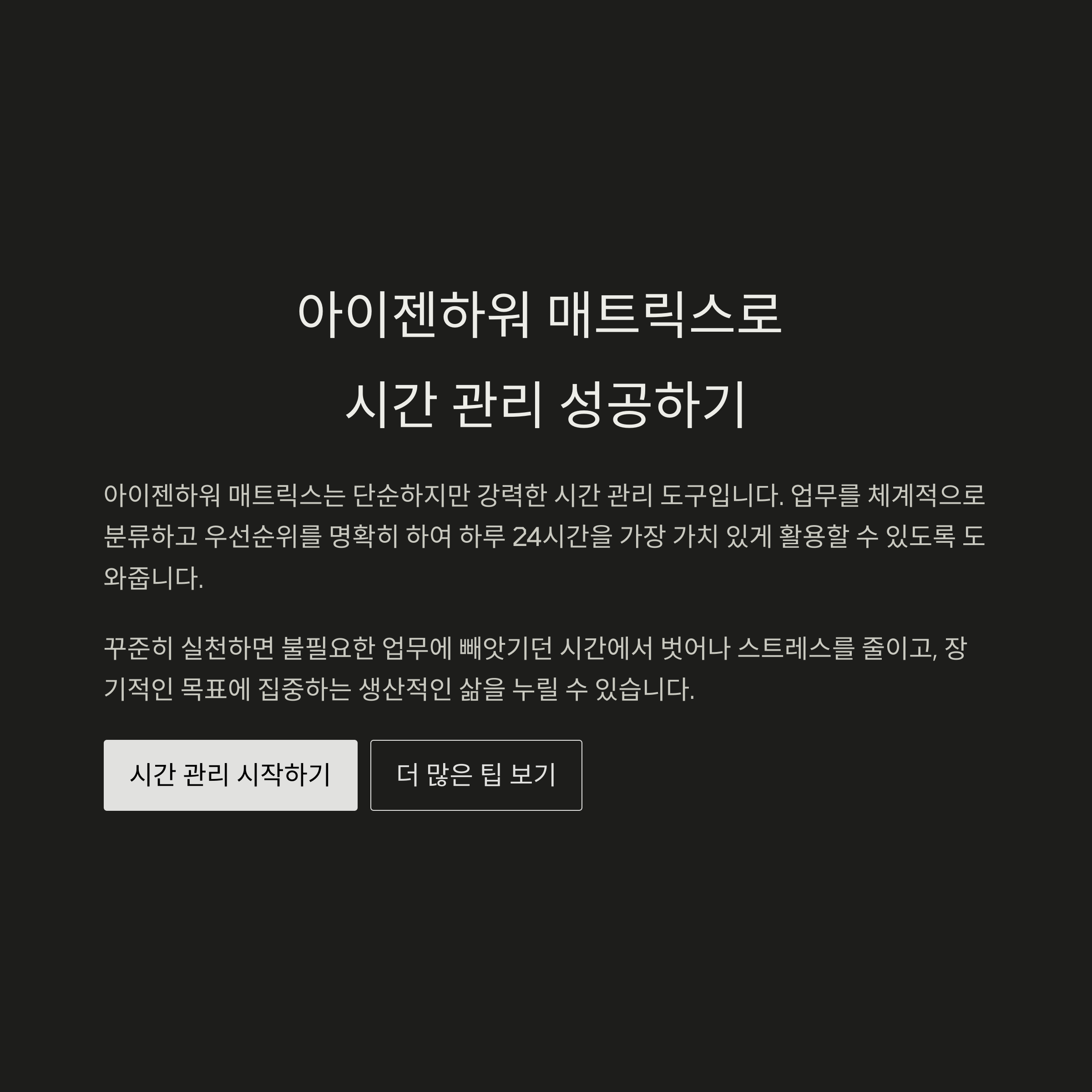 아이젠하워 매트릭스는 단순하지만 강력한 시간 관리 도구입니다. 업무를 체계적으로 분류하고 우선순위를 명확히 하여 하루 24시간을 가장 가치 있게 활용할 수 있도록 도와줍니다.