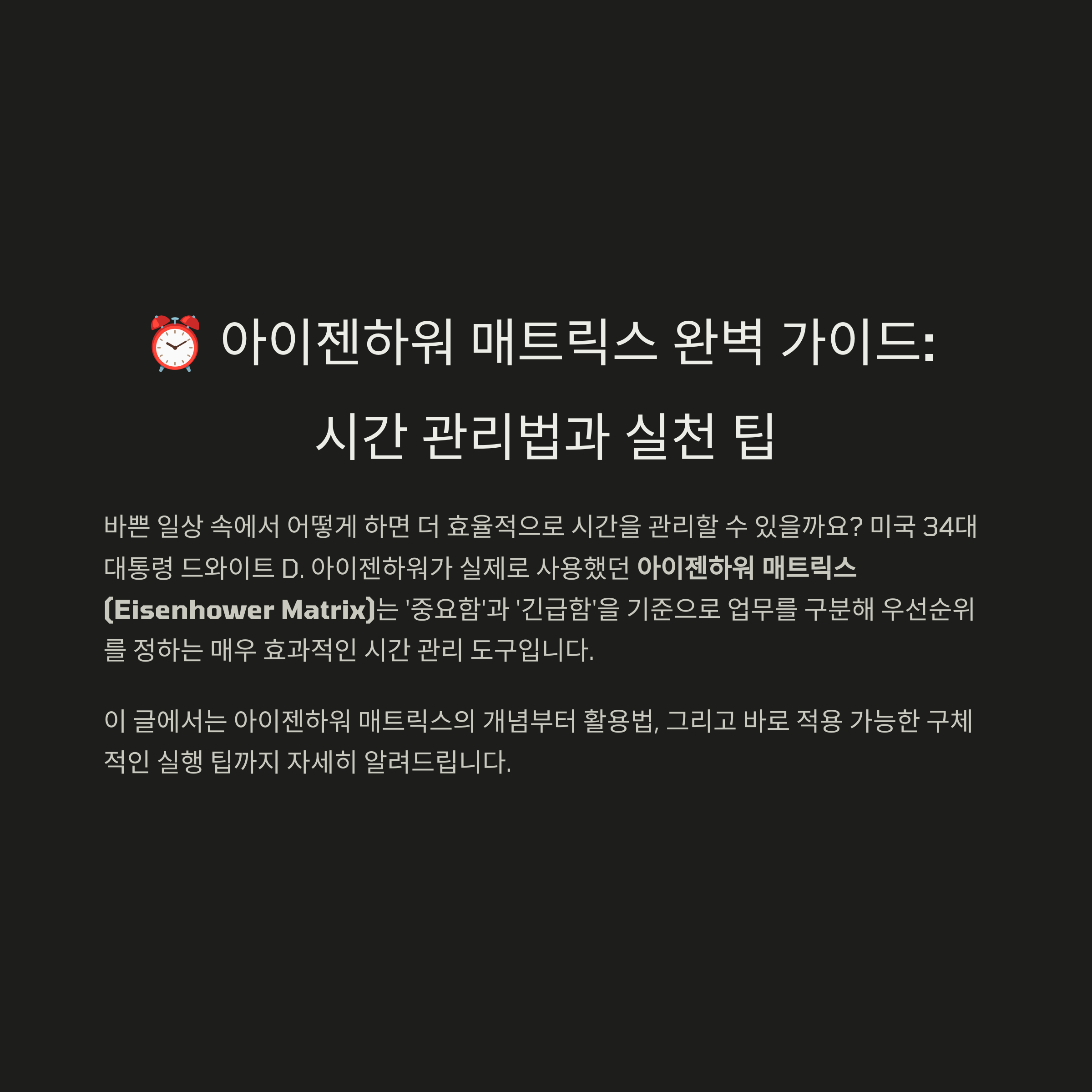 바쁜 일상 속에서 어떻게 하면 더 효율적으로 시간을 관리할 수 있을까요? 미국 34대 대통령 드와이트 D. 아이젠하워가 실제로 사용했던 **아이젠하워 매트릭스(Eisenhower Matrix)**는 ‘중요함’과 ‘긴급함’을 기준으로 업무를 구분해 우선순위를 정하는 매우 효과적인 시간 관리 도구입니다. 이 글에서는 아이젠하워 매트릭스의 개념부터 활용법, 그리고 바로 적용 가능한 구체적인 실행 팁까지 자세히 알려드립니다.