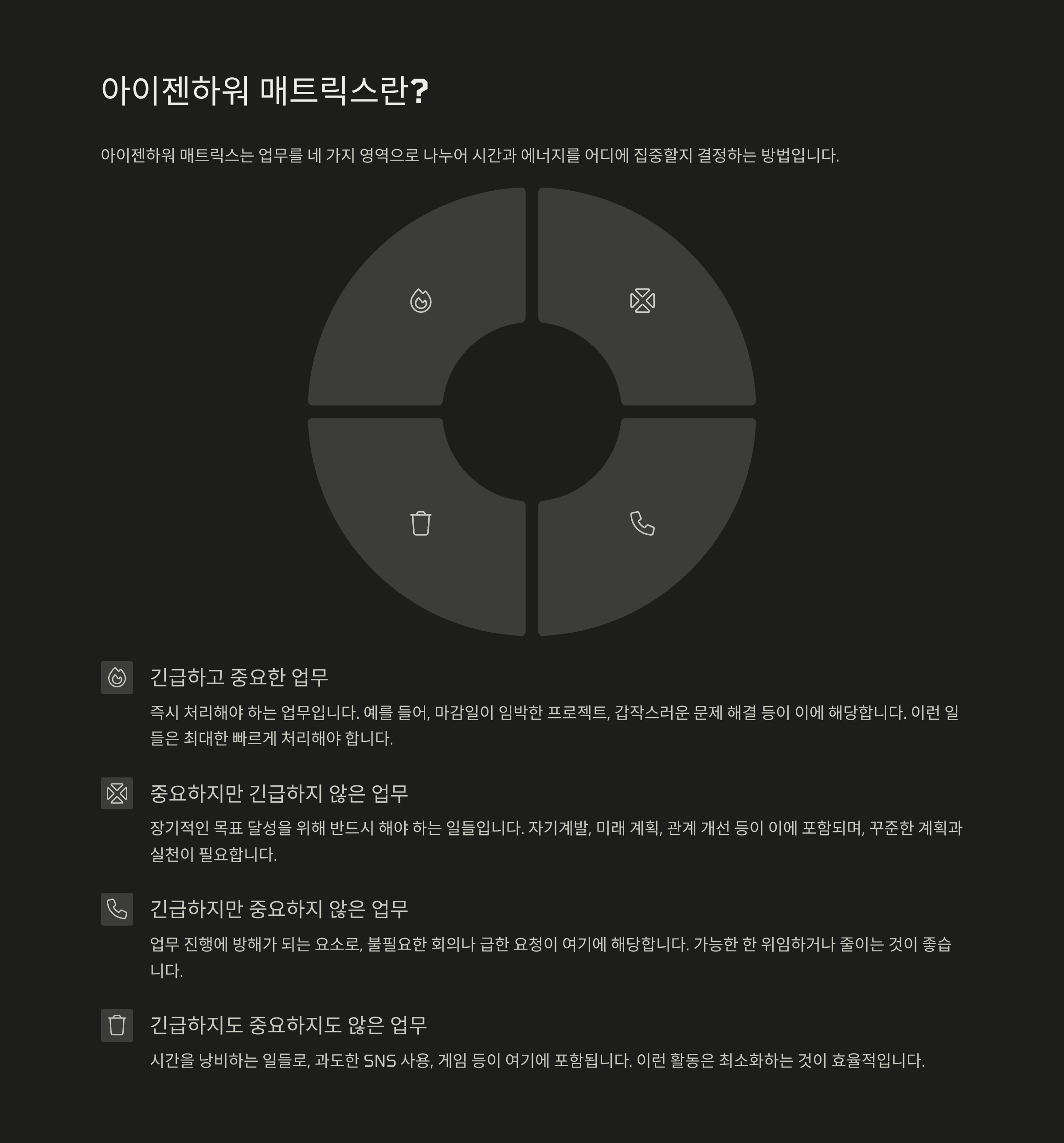 아이젠하워 매트릭스는 업무를 네 가지 영역으로 나누어 시간과 에너지를 어디에 집중할지 결정하는 방법입니다.