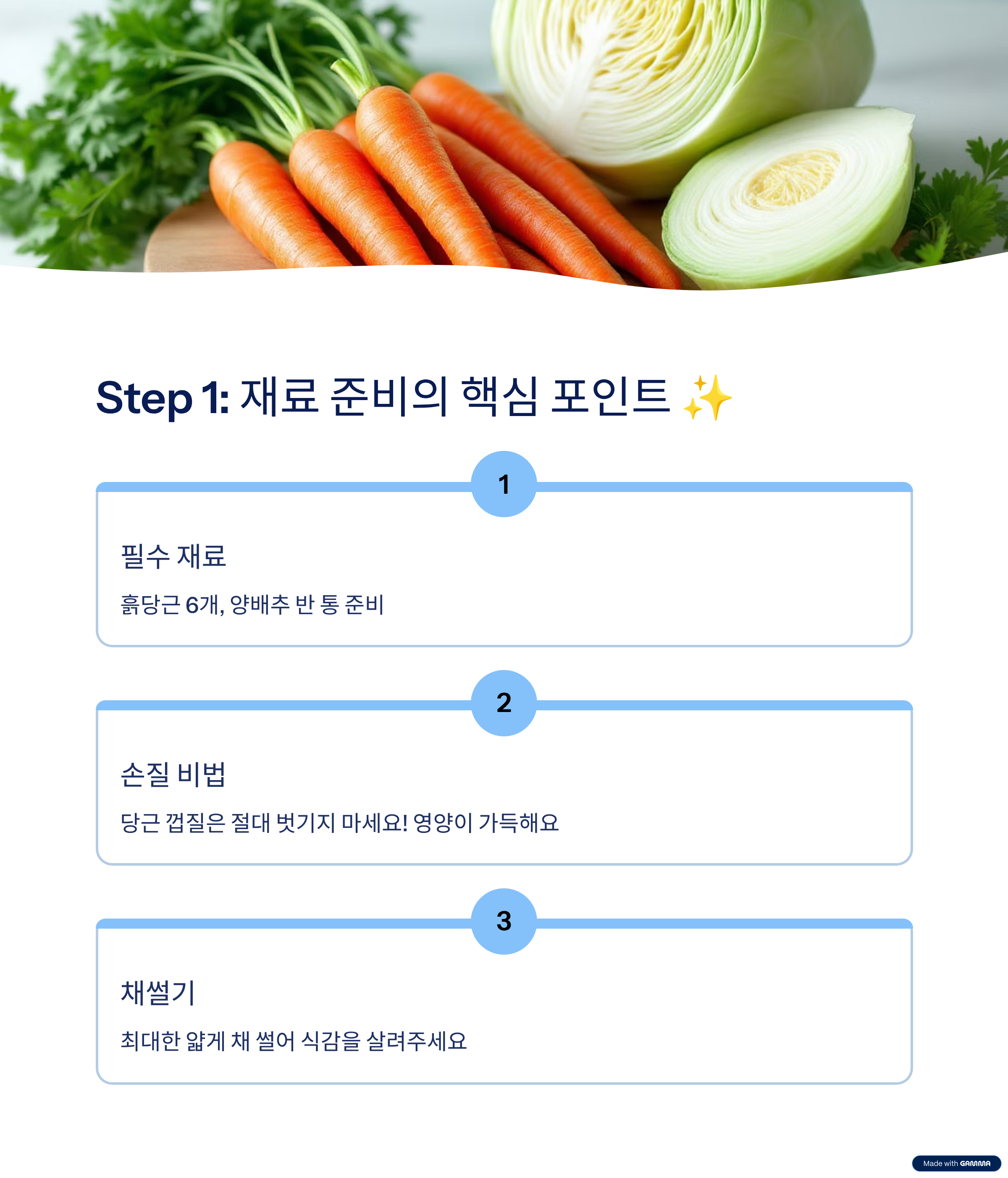 - 손질 비법: 당근은 껍질에 영양이 많으니, 깨끗이 씻은 후 껍질은 절대 벗기지 말고 그대로 사용하세요!