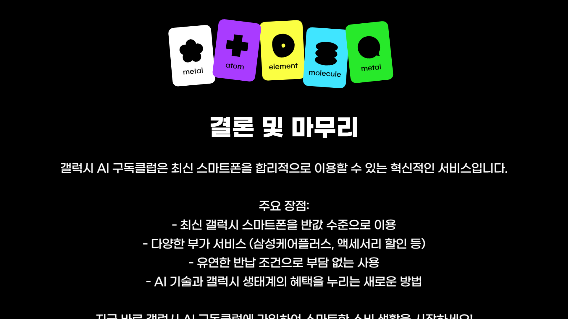 갤럭시 AI 구독클럽은 최신 갤럭시 스마트폰을 부담 없이 경험하고 싶은 분들에게 최적의 선택입니다. 매달 5,900원이라는 합리적인 비용으로, 다양한 혜택과 서비스를 제공받을 수 있습니다. 갤럭시의 최신 기술과 혜택을 누리고 싶다면, 지금 바로 갤럭시 AI 구독클럽에 가입해보세요!