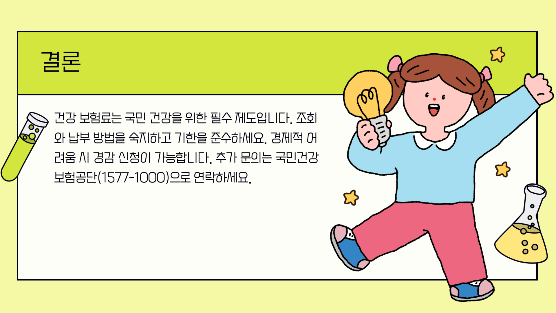 건강 보험료는 국민 모두의 건강을 위한 중요한 제도입니다. 위의 정보를 활용하여 편리하게 조회하고 납부하세요. 추가로 궁금한 사항이 있다면 국민건강보험공단 고객센터로 문의하시기 바랍니다!