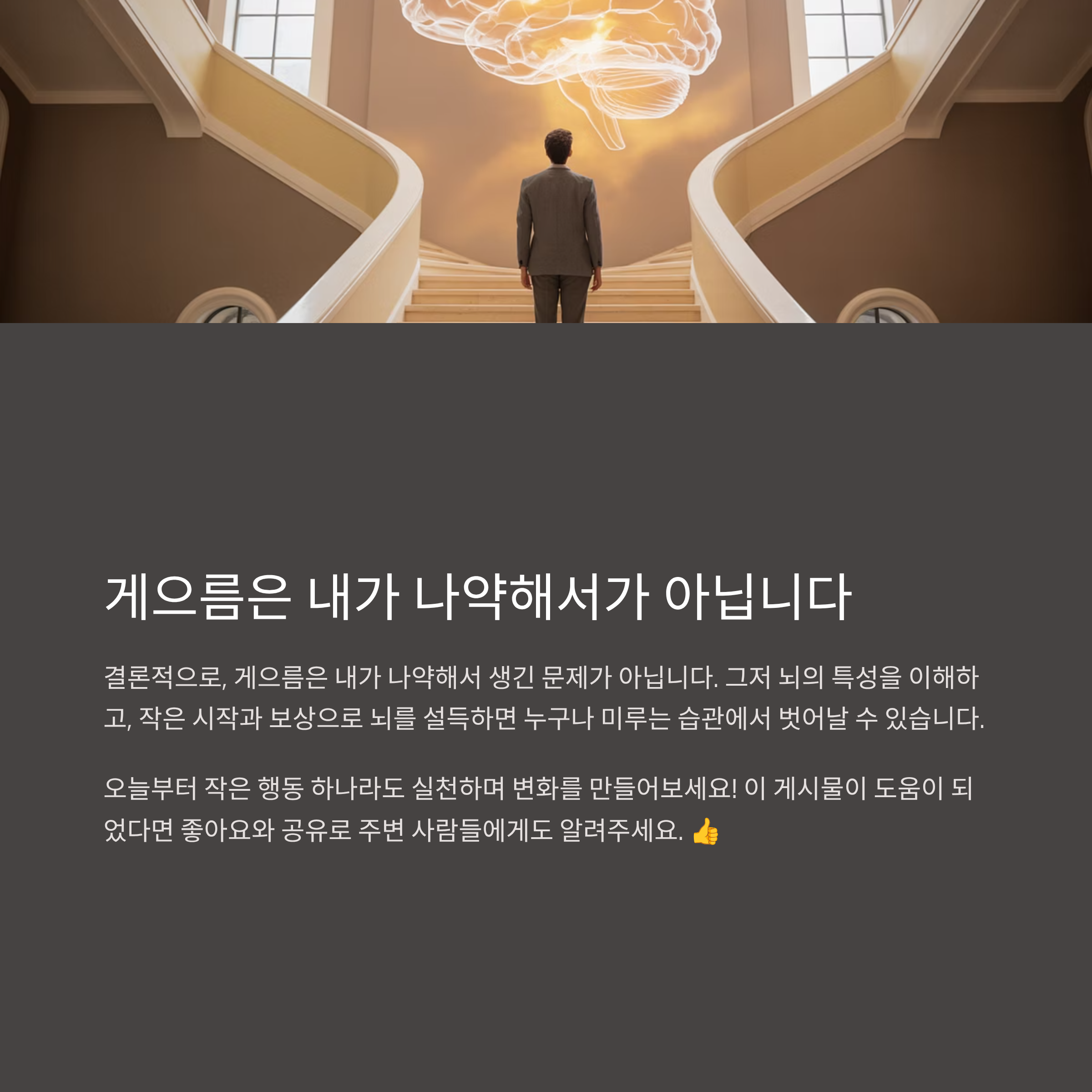 결론적으로, 게으름은 내가 나약해서 생긴 문제가 아닙니다. 그저 뇌의 특성을 이해하고,