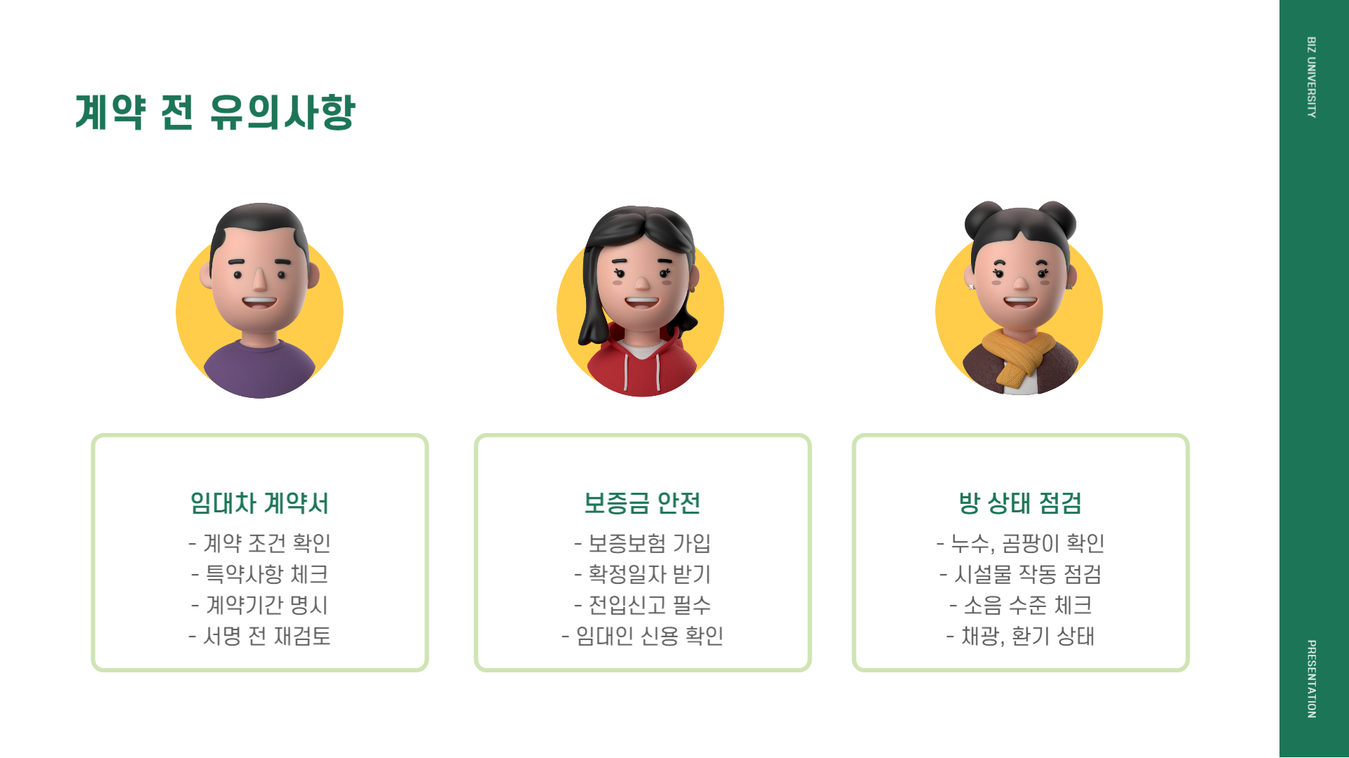 방 상태, 계약 조건, 추가 비용을 철저히 확인.