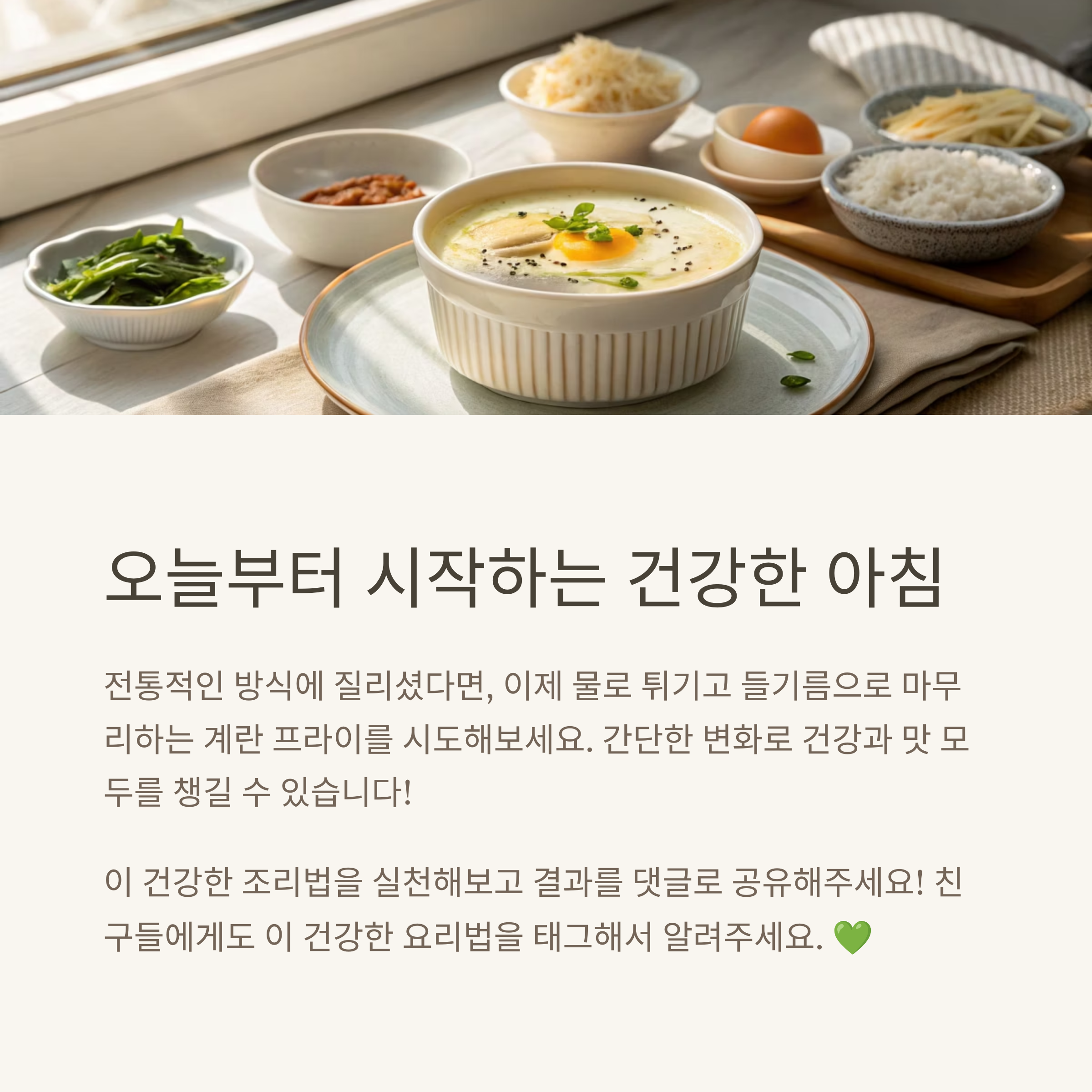 전통적인 계란 프라이 방식이 질리고, 건강까지 생각한 조리법을 찾고 계셨다면 이번 ‘물로 튀기기’ 방식에 들기름 한 스푼 더해보세요. 단순하지만 똑똑한 변화가 식탁을 더 풍성하게 만들어 줄 거예요.