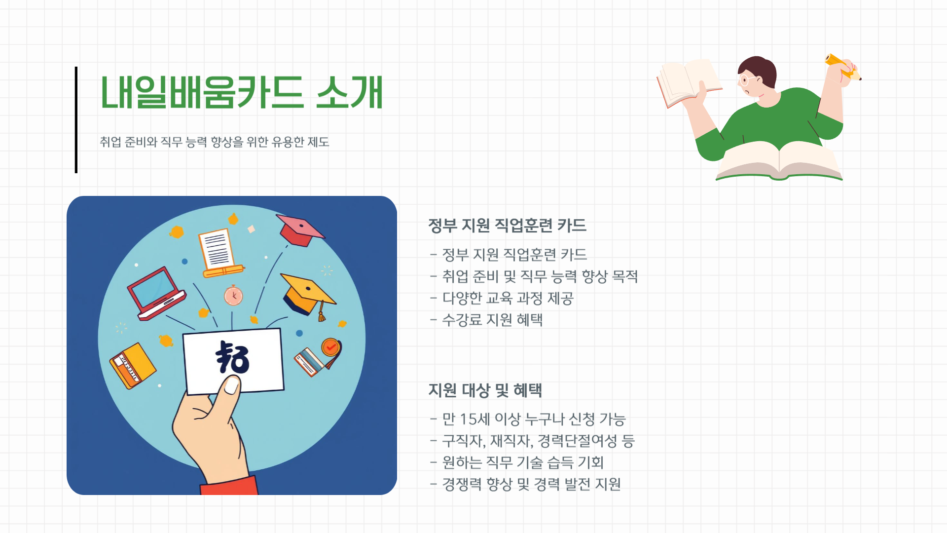 내일배움카드는 취업 준비와 직무 능력 향상에 매우 유용한 제도예요. 신청 방법도 간단하고, 다양한 훈련 과정을 통해 새로운 지식과 기술을 배울 수 있으니 꼭 활용해보세요! 내일배움카드를 통해 더 나은 미래를 준비하고, 원하는 직업에 한 걸음 더 다가
