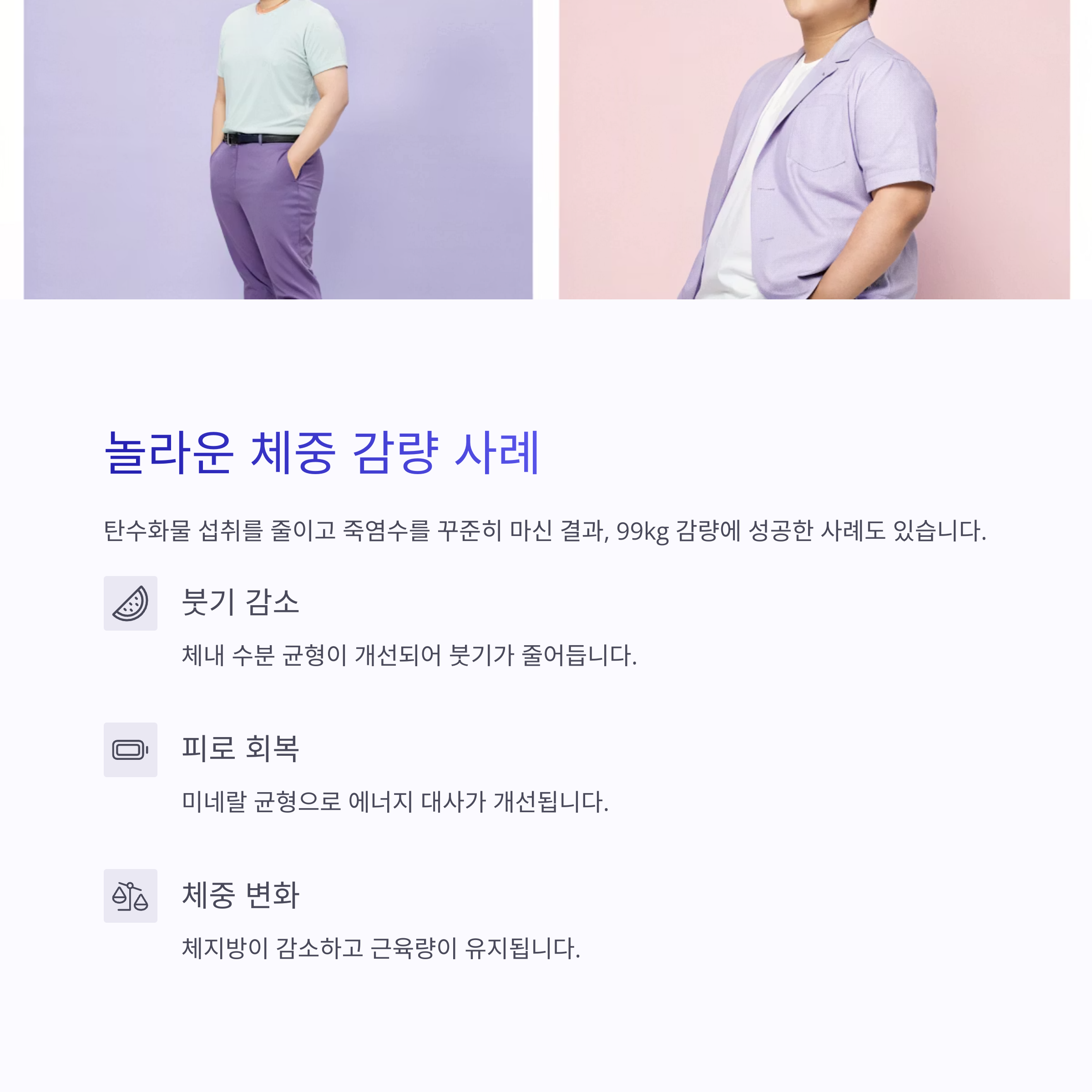 실제 사례 중에는 탄수화물 섭취를 줄이고 죽염수를 꾸준히 마신 결과, 99kg 감량에 성공한 경우도 있습니다. 물론 이는 개인차가 크지만, 많은 분들이 붓기 감소, 피로 회복, 체중 변화를 경험하고 있습니다.