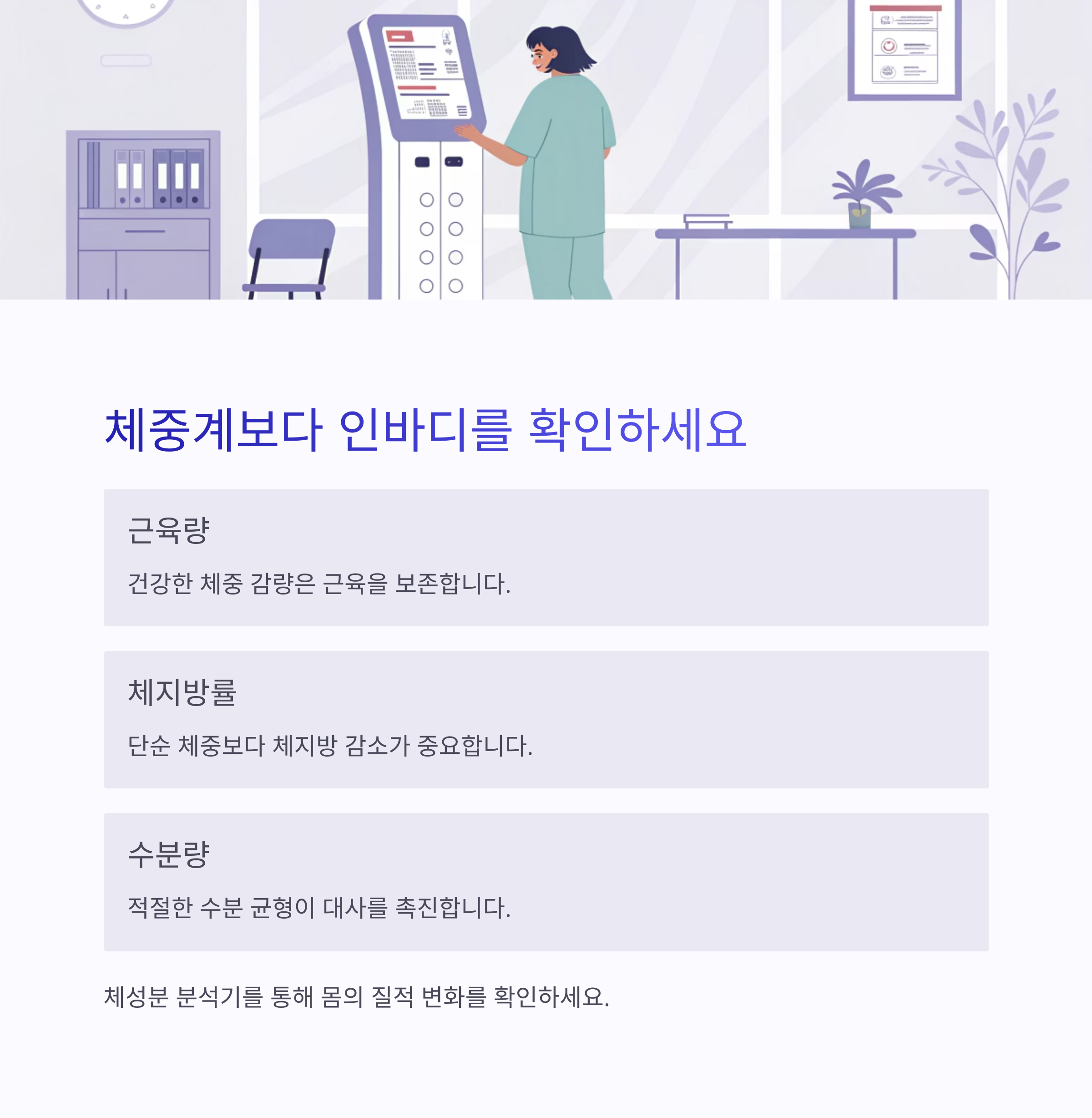 단순히 체중 숫자만 줄어드는 것이 아니라, 근육량, 체지방률, 수분량의 변화가 더욱 중요합니다. 체성분 분석기를 통해 몸의 질적 변화를 확인하세요.