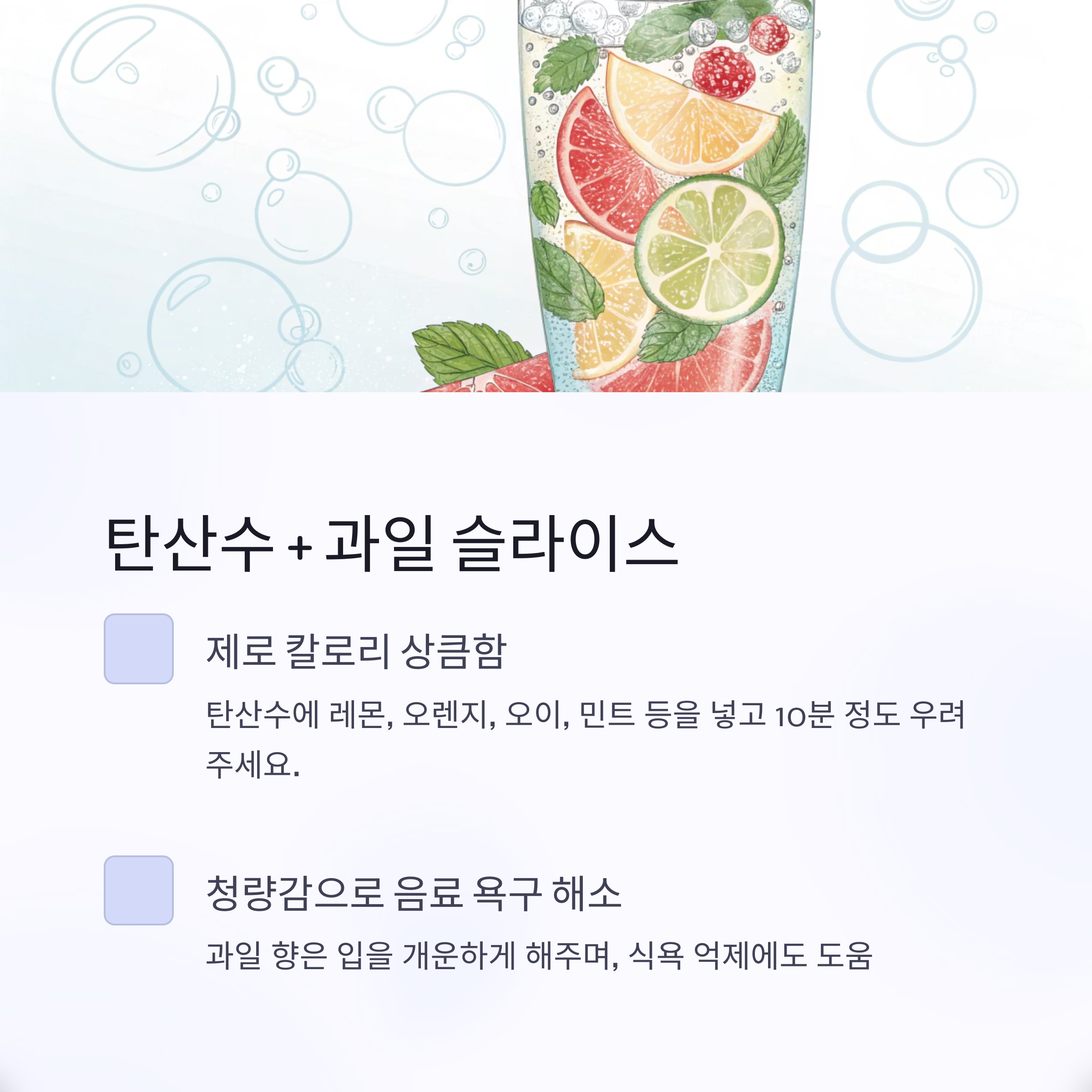 1. 탄산수 + 과일 슬라이스 (제로 칼로리 상큼함)