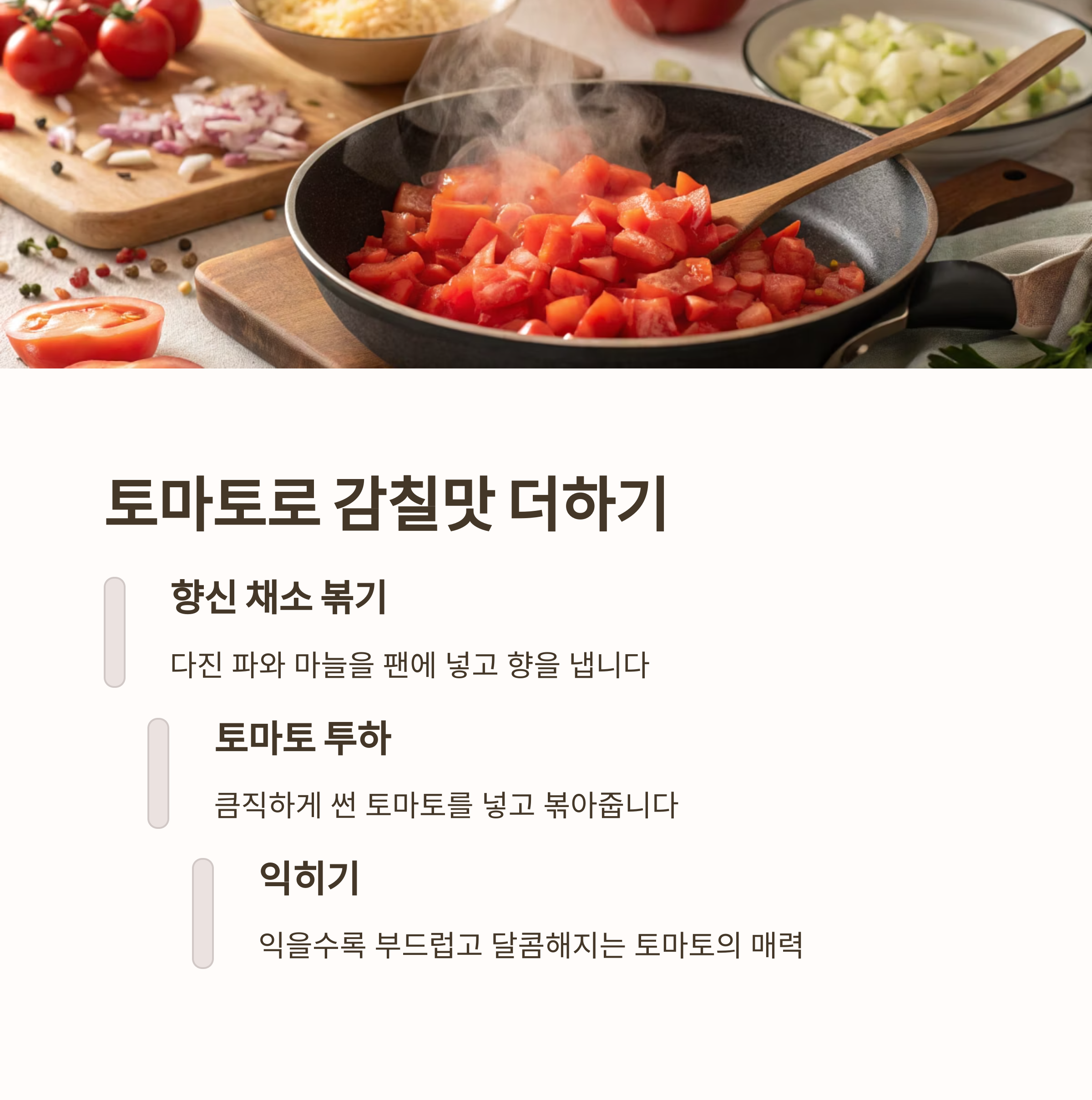 익을수록 부드럽고 달콤해지는 토마토는 이 레시피의 감칠맛 포인트입니다.