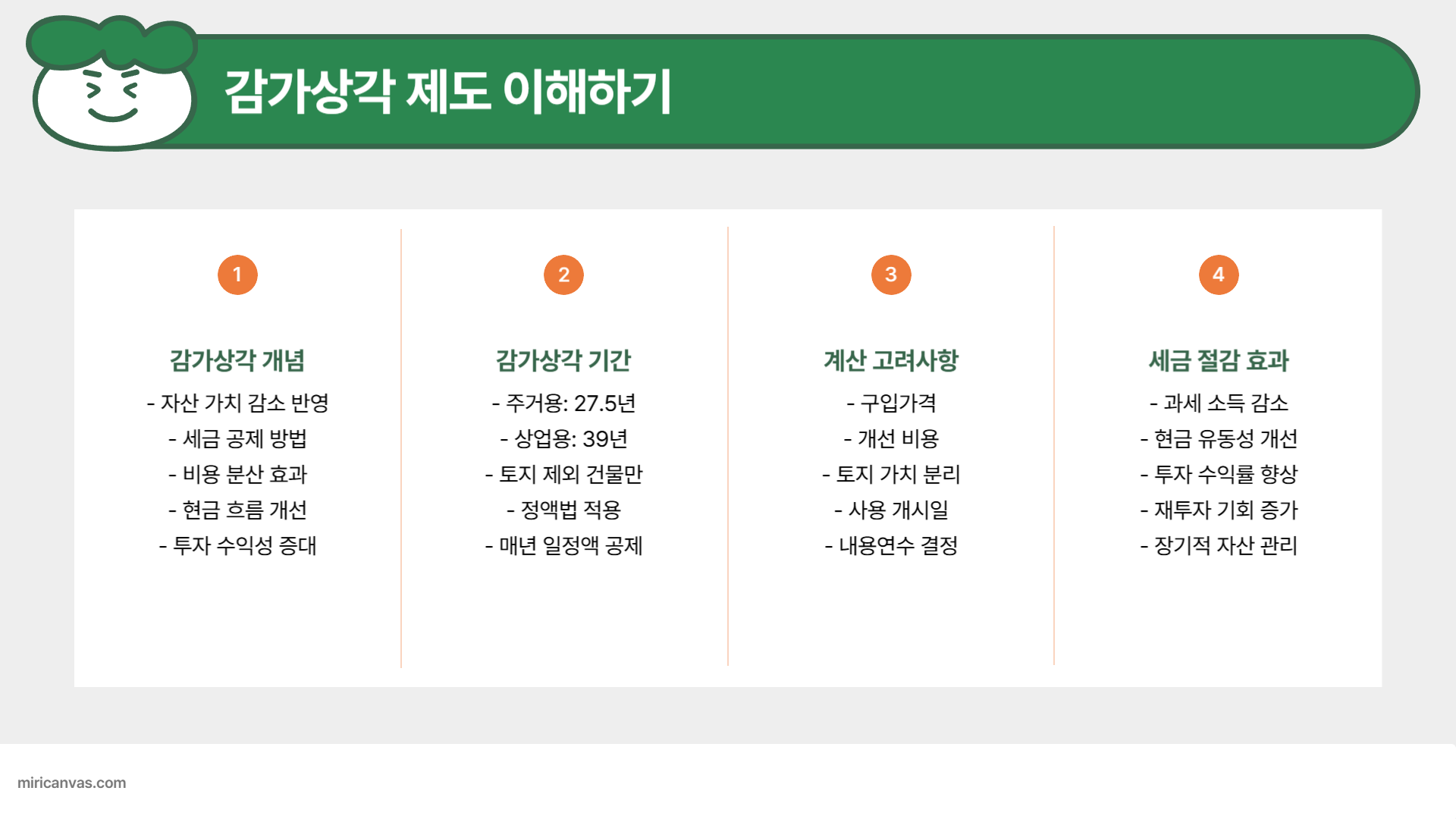 감가상각은 부동산 자산의 가치가 시간에 따라 감소하는 것을 반영하는 세금 공제 방법입니다. 예를 들어, 주거용 부동산은 일반적으로 27.5년, 상업용 부동산은 39년 동안 감가상각이 가능합니다. 이를 통해 매년 일정 금액을 세금에서 공제받을 수 있어, 실질적인 세금 부담을 줄일 수 있습니다. 감가상각을 계산할 때는 자산의 구입가격, 개선 비용 등을 고려해야 합니다.