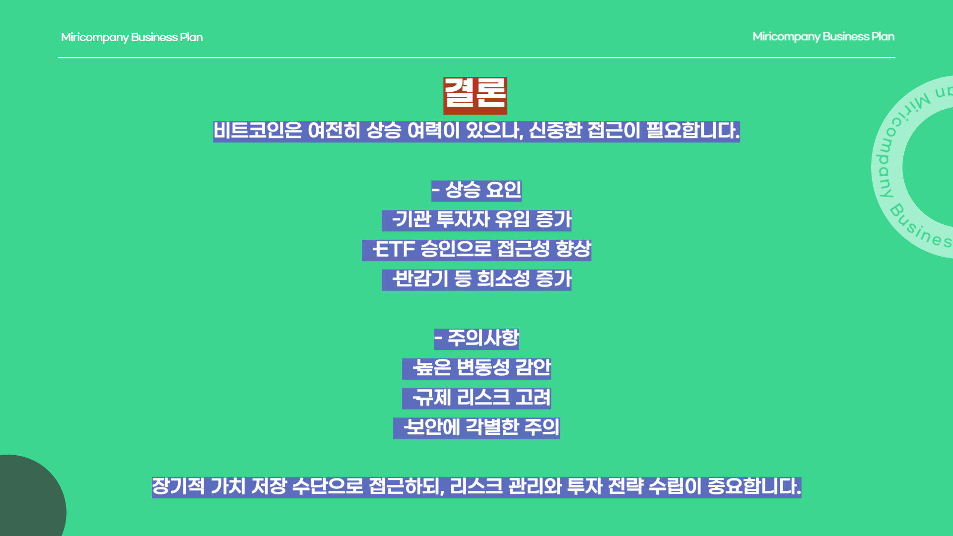 ✅ 결론적으로, 비트코인 투자는 개인의 리스크 감내 수준과 투자 목표에 따라 다르며, 신중한 접근이 필요합니다. 단기 수익보다는 장기적 가치 저장 수단으로 고려하는 것이 더욱 안전한 전략이 될 수 있습니다.