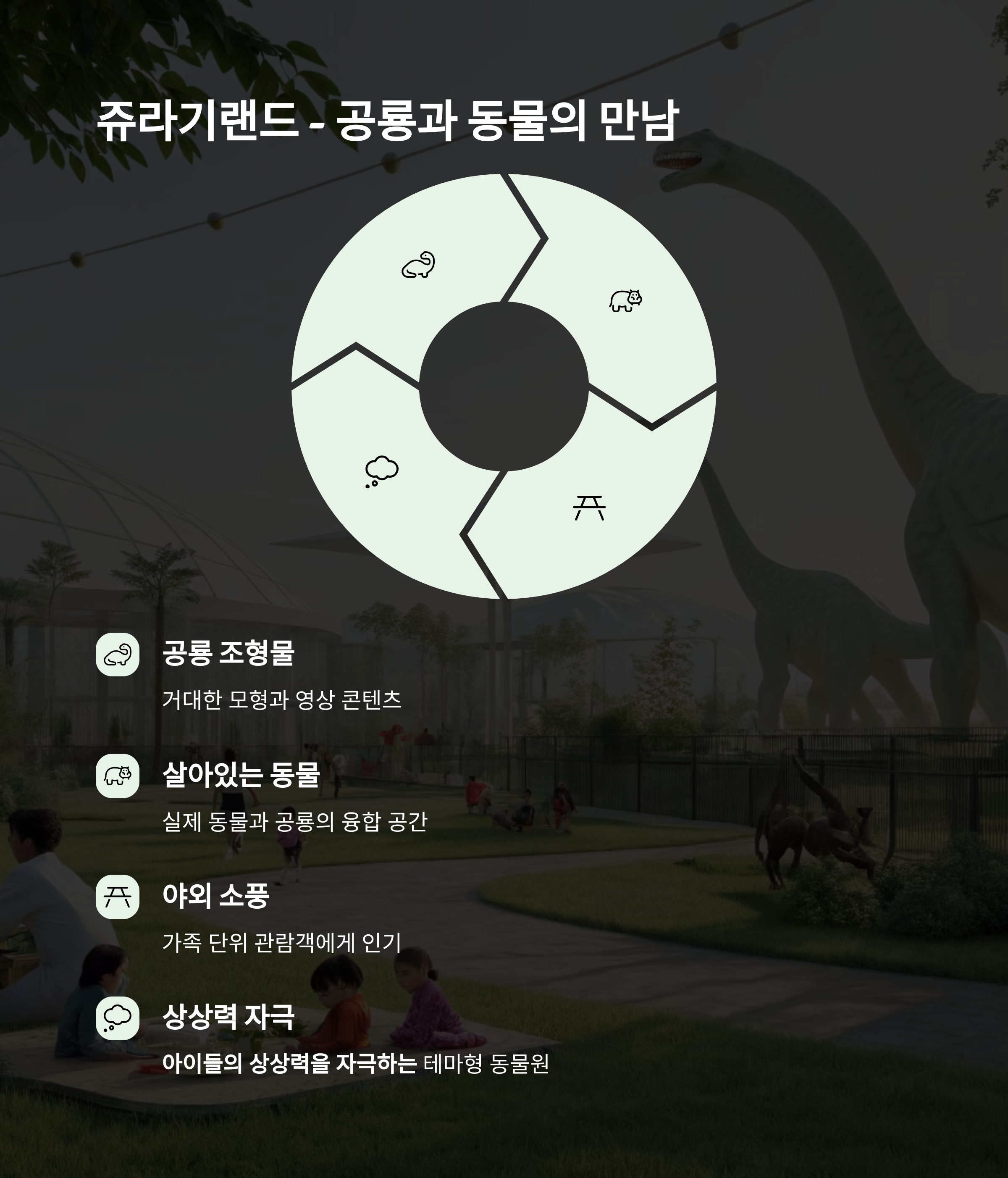 실제 동물 외에도 거대한 모형과 영상 콘텐츠를 활용하여