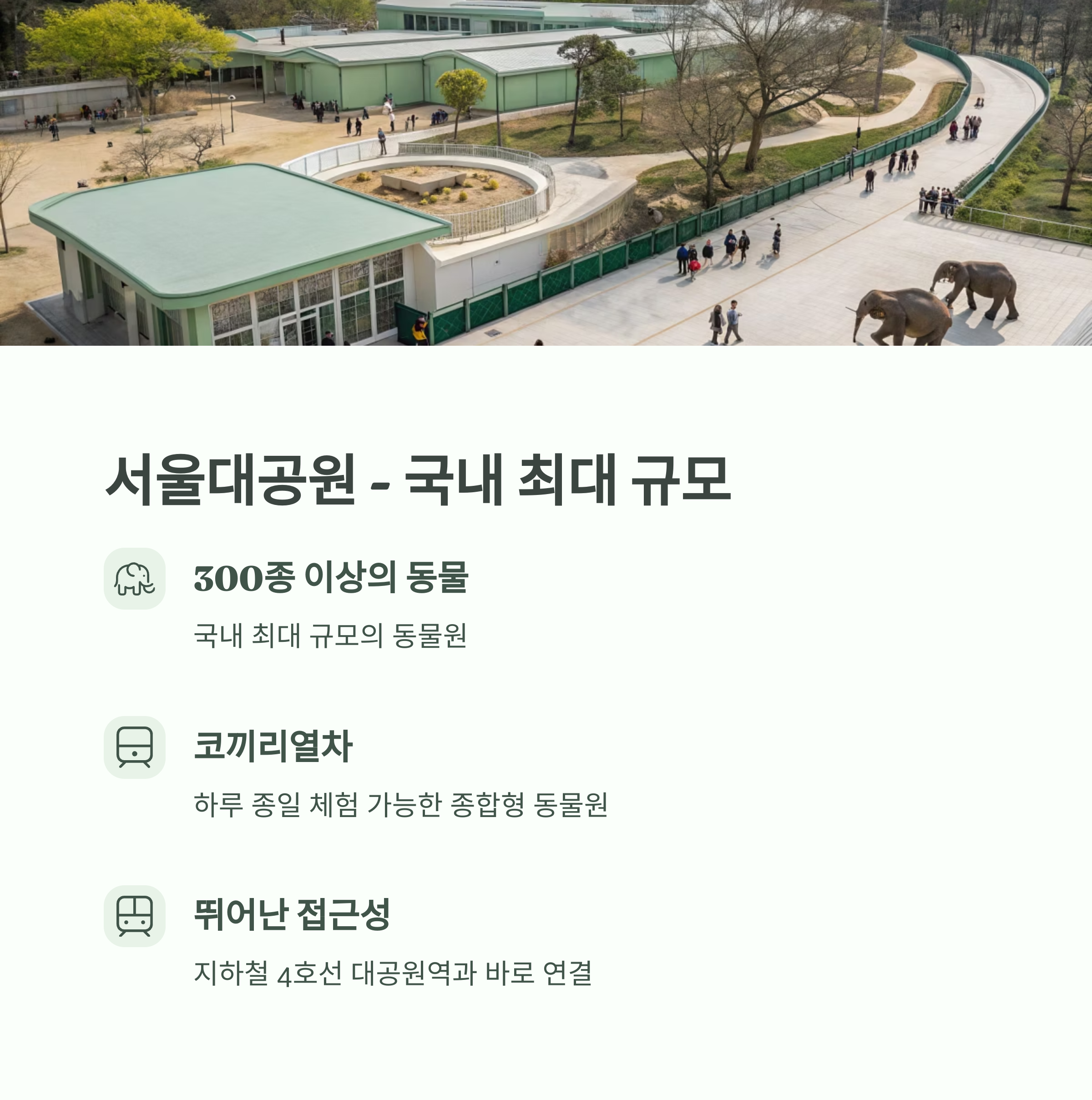 코끼리열차, 동물 해설 프로그램, 어린이 동물원까지 구성되어 있어