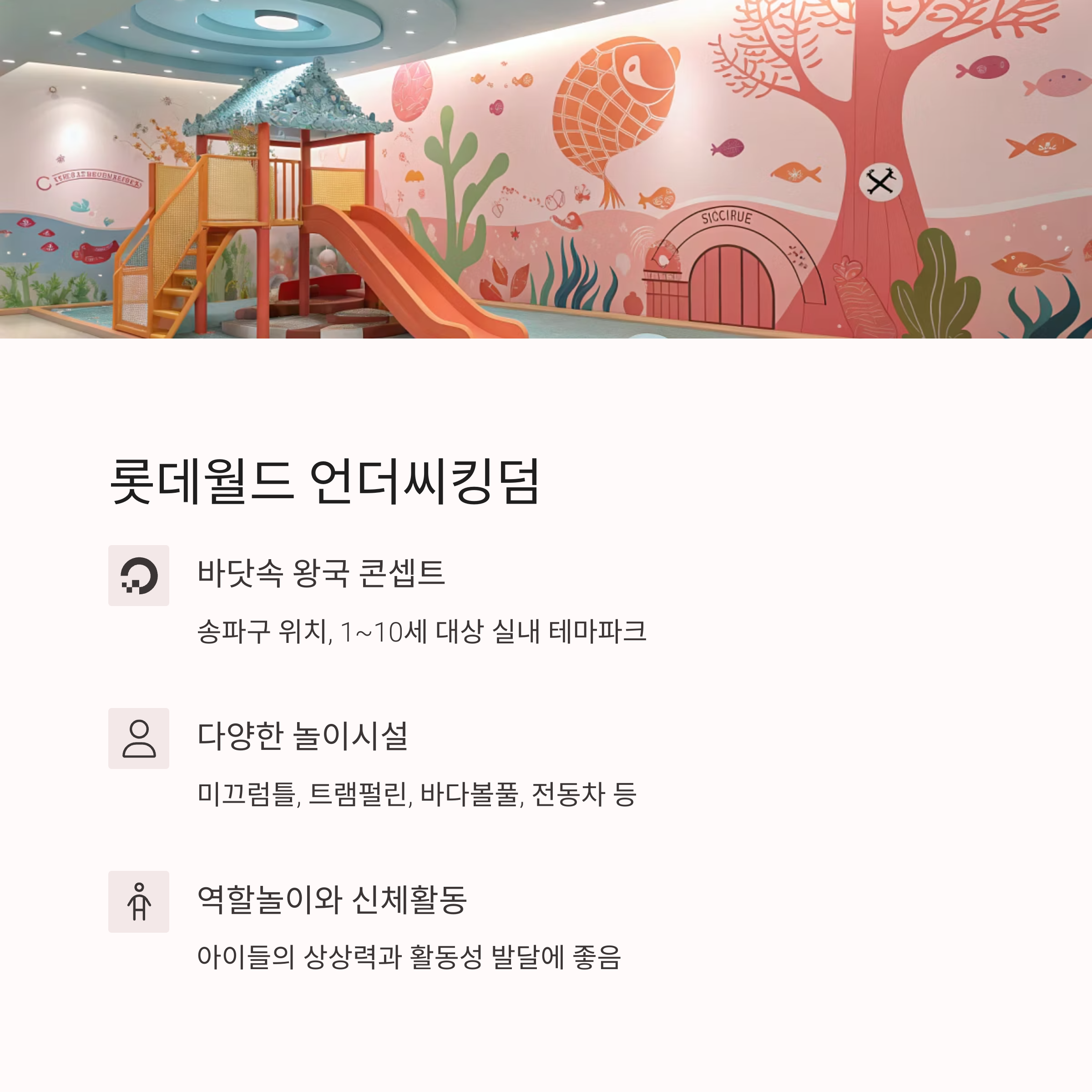 대형 실내 테마파크입니다. 1~10세 대상의 놀이시설로 구성돼