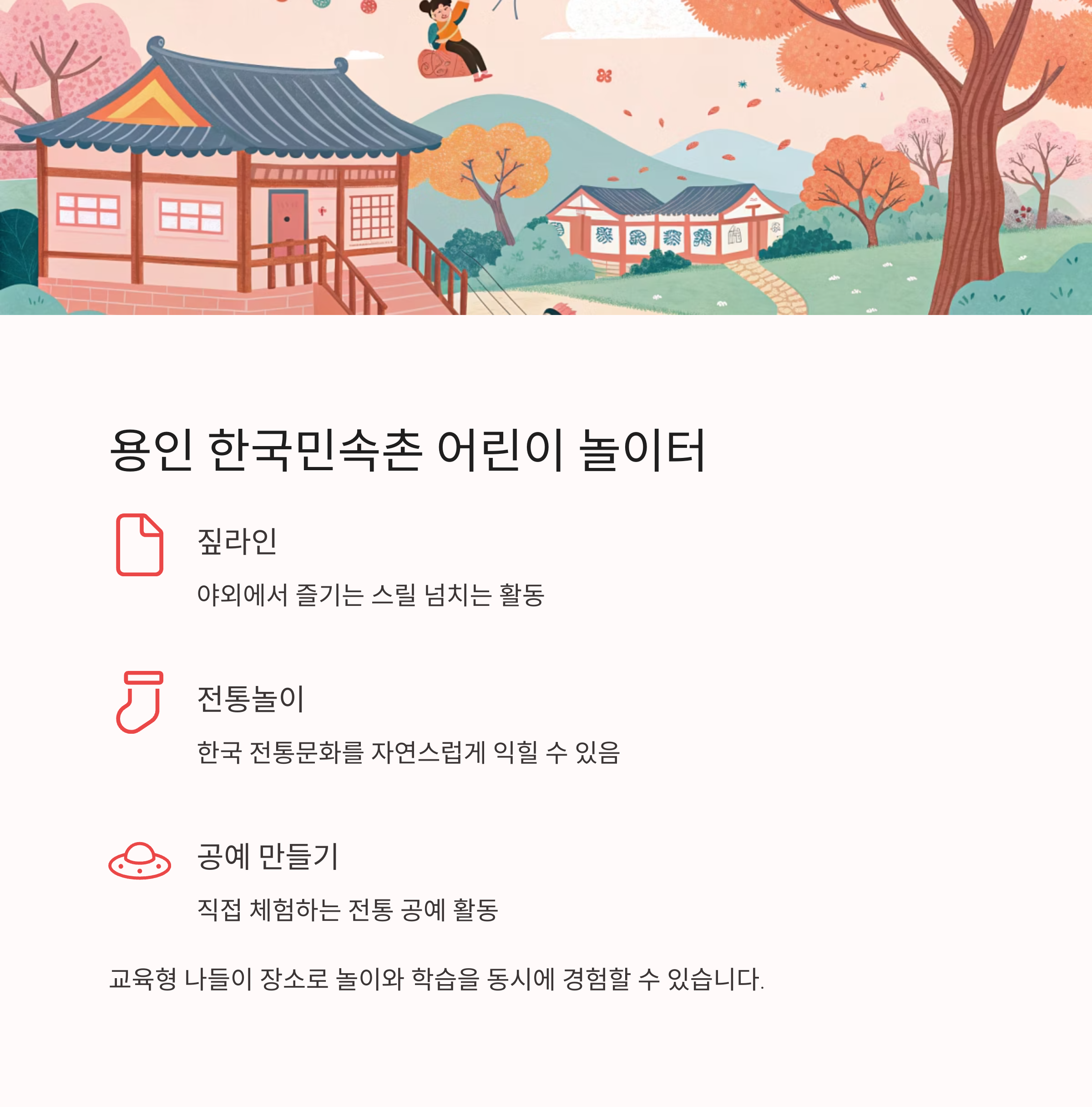 놀이와 함께 한국의 전통문화를 자연스럽게 익힐 수 있는 교육형 나들이 장소입니다.
