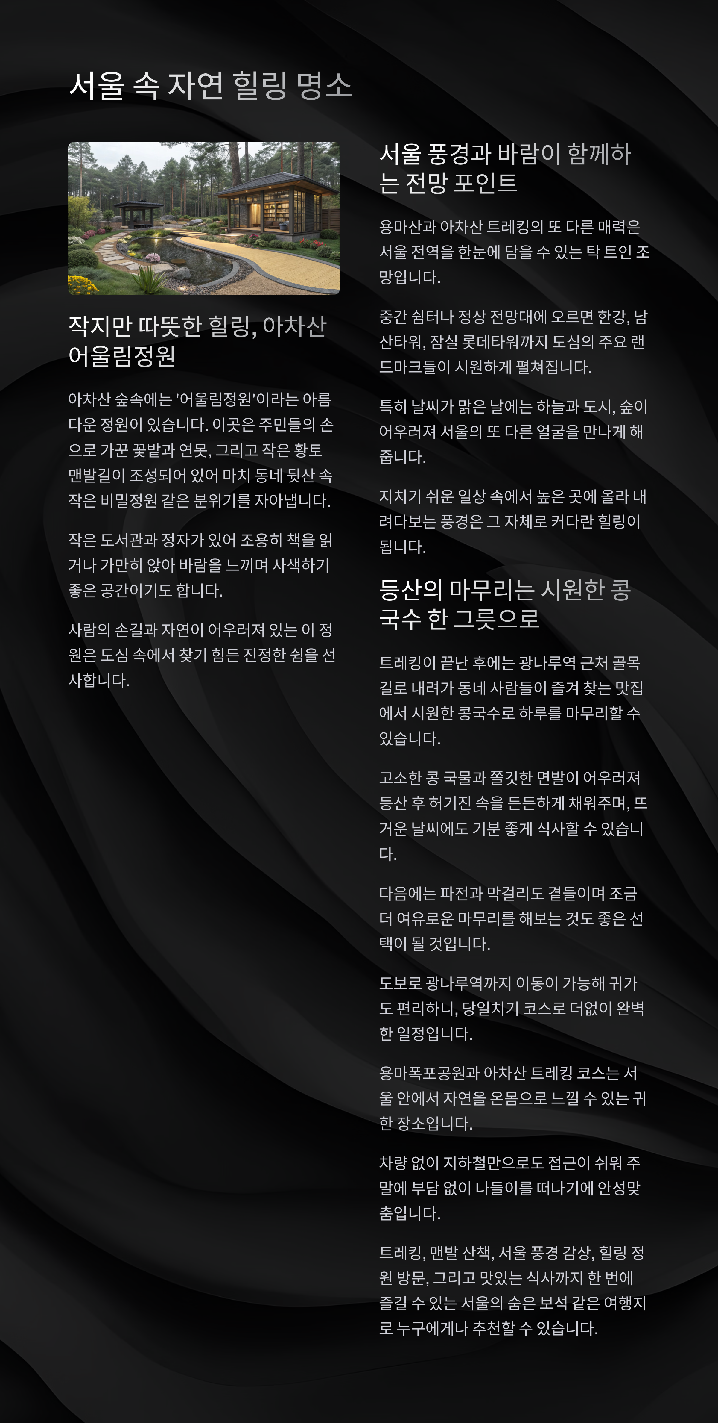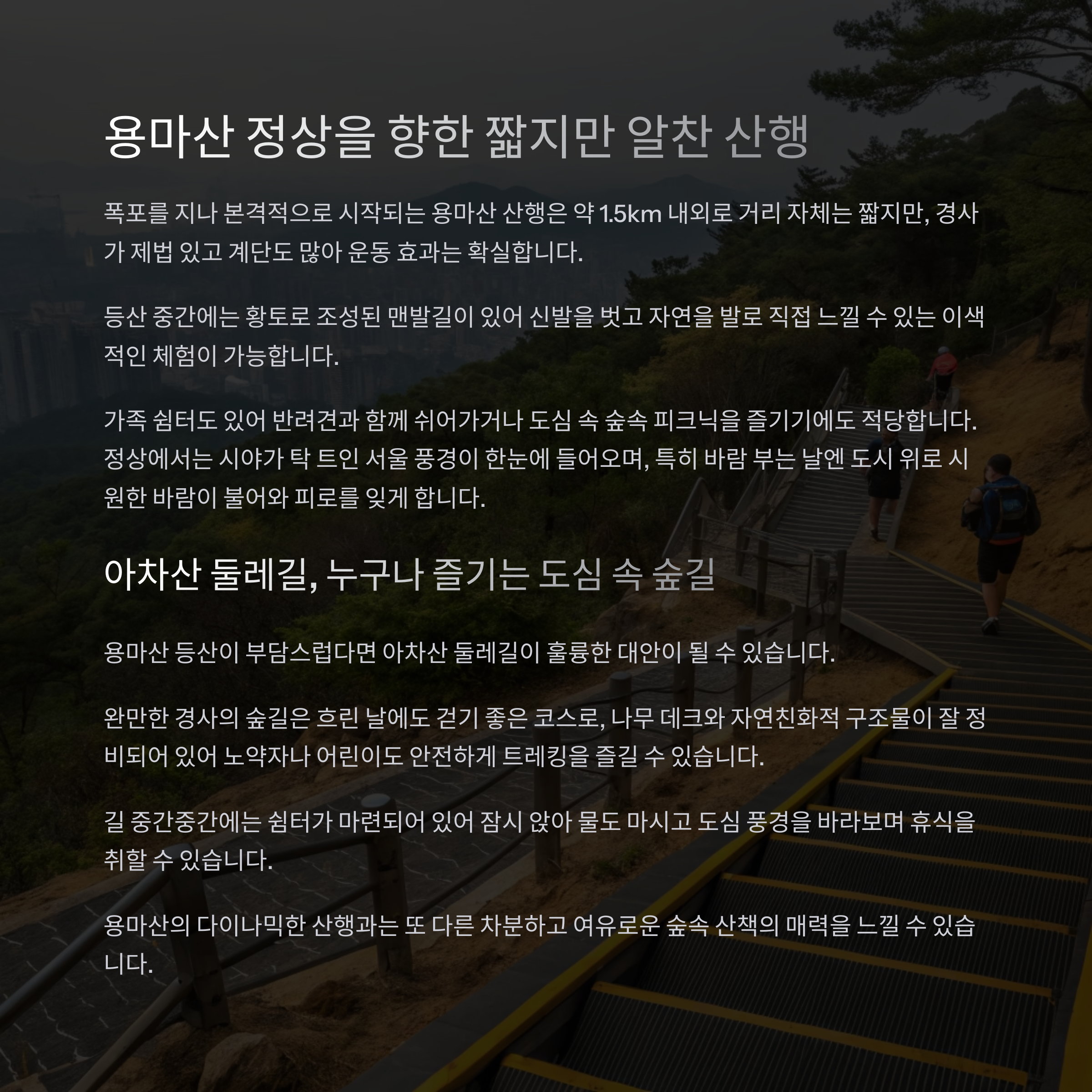 서울에서 자연과 함께하는 여유로운 하루를 보내고 싶다면, 지하철 7호선 용마산역 1번 출구에서 시작하는 트레킹 코스를 추천드립니다. 이곳에는 동양 최대 규모의 인공폭포인 ‘용마폭포’가 웅장한 물줄기를 자랑하며, 맨발로 걷는 황토길과 도심이 한눈에 내려다보이는 용마산 전망대까지 다양한 자연 체험이 기다리고 있습니다. 아차산 둘레길과 어울림정원을 함께 즐기면 서울 안에서도 충분한 힐링이 가능합니다.