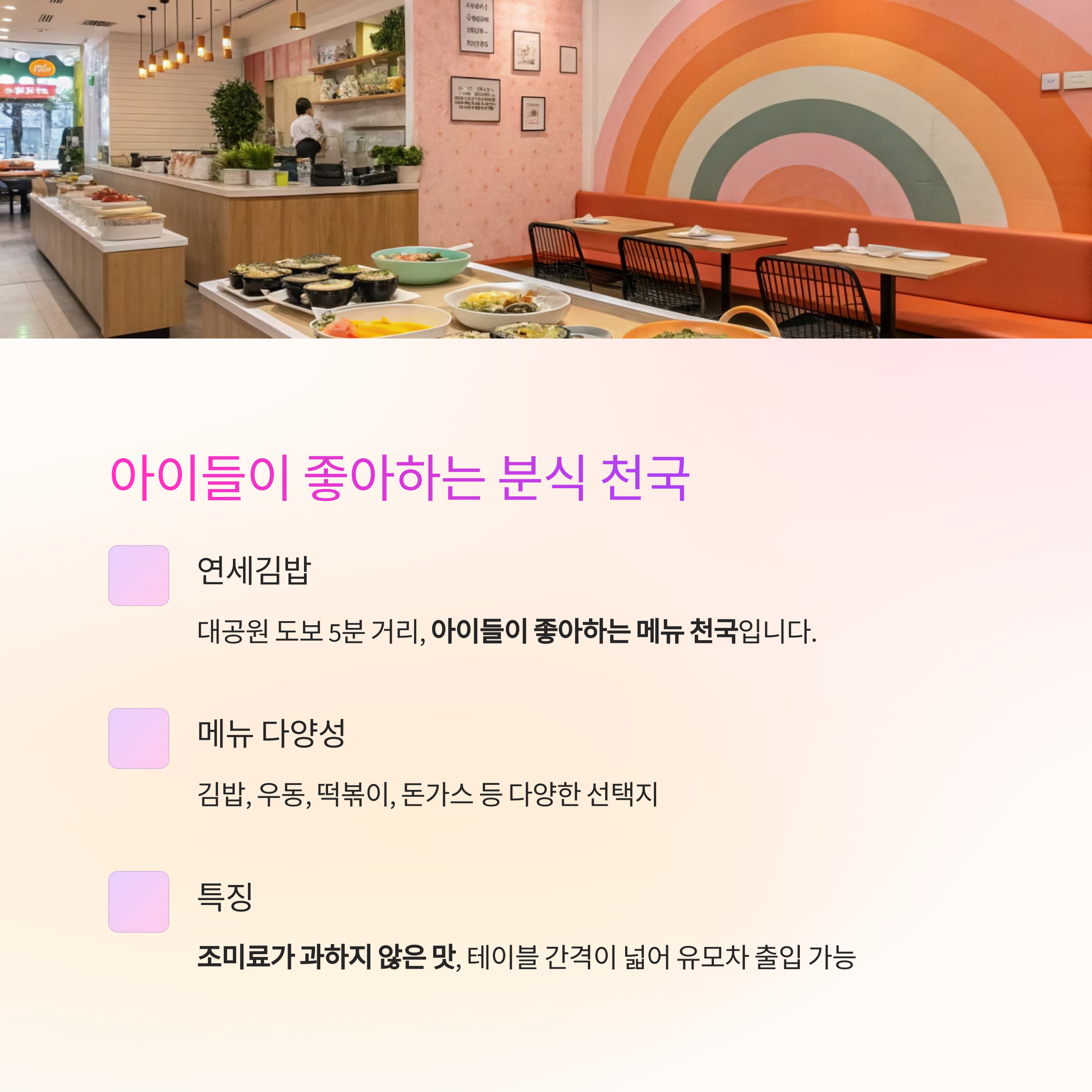 | 메뉴 다양성 | 유아~초등학생 입맛까지 고려 |