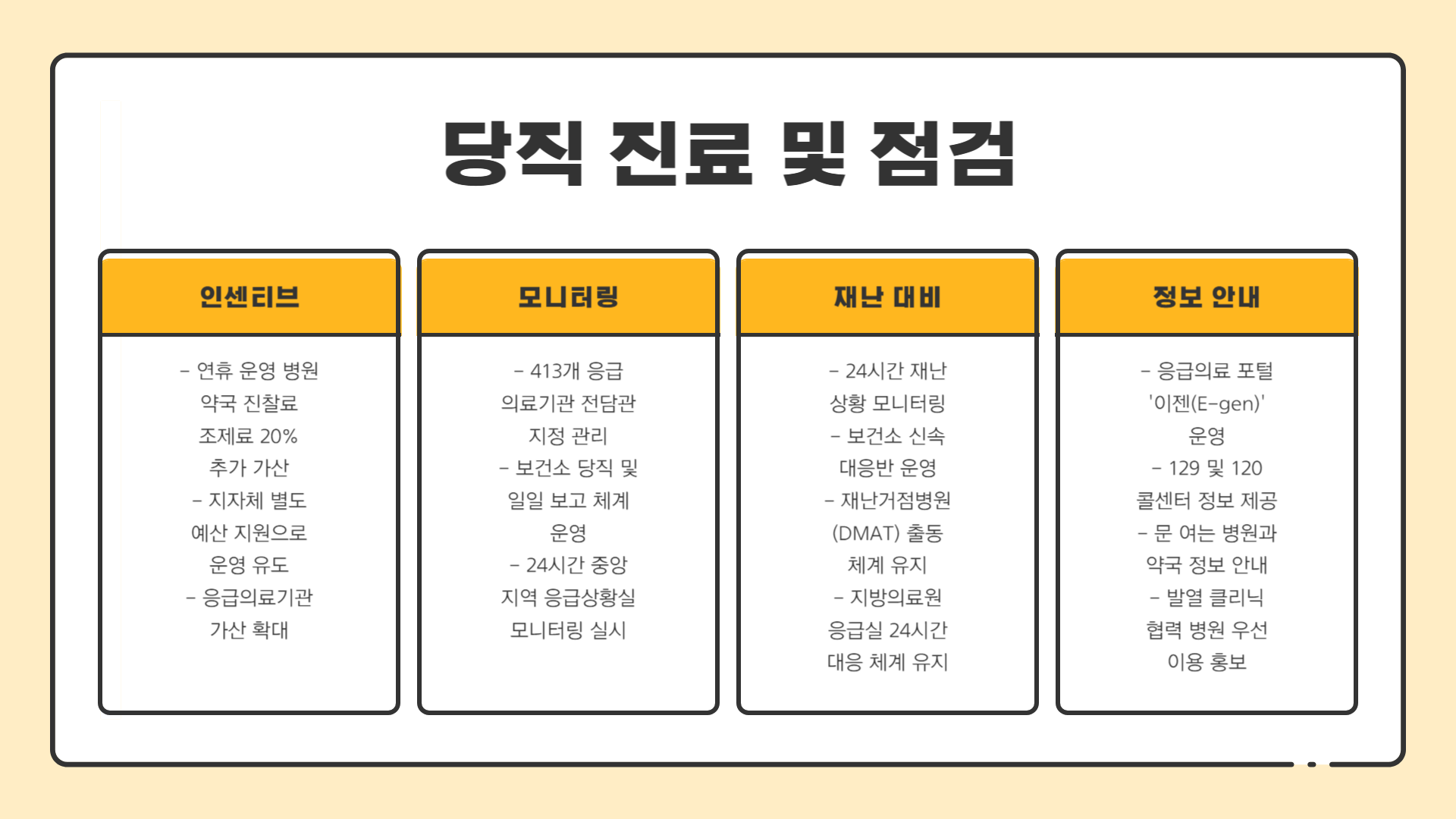 설 연휴 기간 동안 문을 여는 병원과 약국에 대해 진찰료와 조제료를 20% 추가 가산하며, 지방자치단체별로 별도 예산 지원 등을 통해 최대한 많은 병원이 운영될 수 있도록 유도할 예정이다. 전국 413개 응급의료기관에 전담관을 지정하여 관리하고, 보건소 당직 및 일일 보고 체계를 운영하며 중앙 및 지역 응급상황실의 24시간 모니터링도 실시한다.
