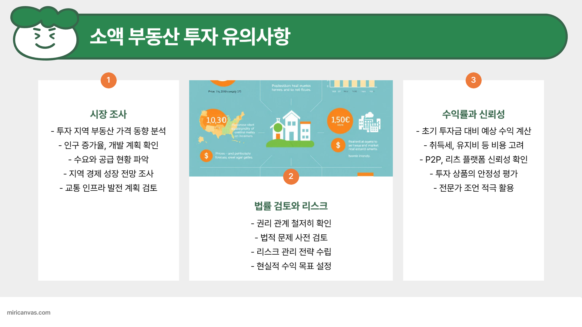 소액 부동산 투자는 자금이 부족한 초보 투자자도 시작할 수 있는 훌륭한 방법입니다. 적은 금액으로 부동산 투자에 대한 감각을 키우고, 점차 더 큰 기회를 잡을 수 있습니다. 중요한 것은 철저한 준비와 현실적인 목표 설정입니다.