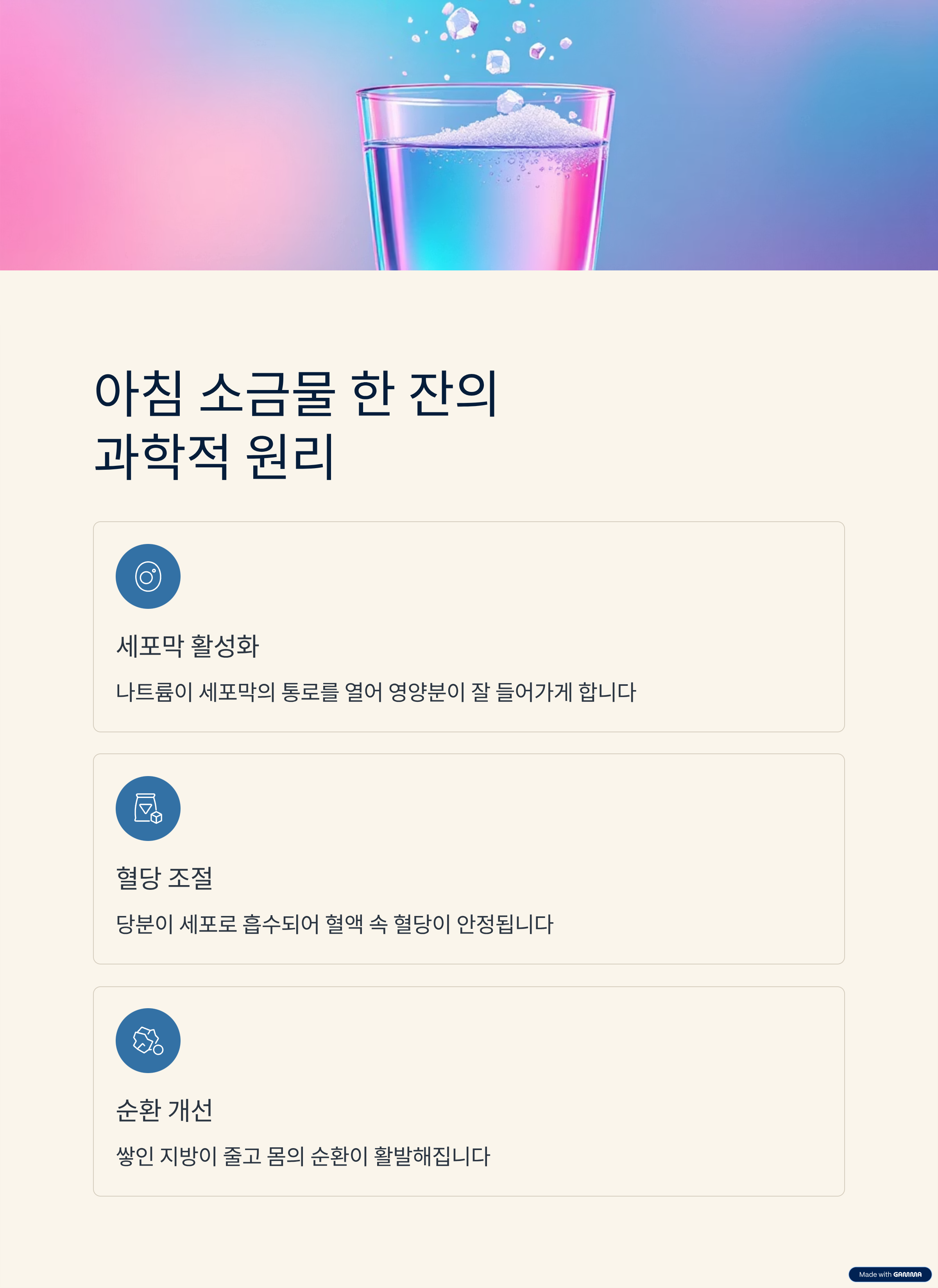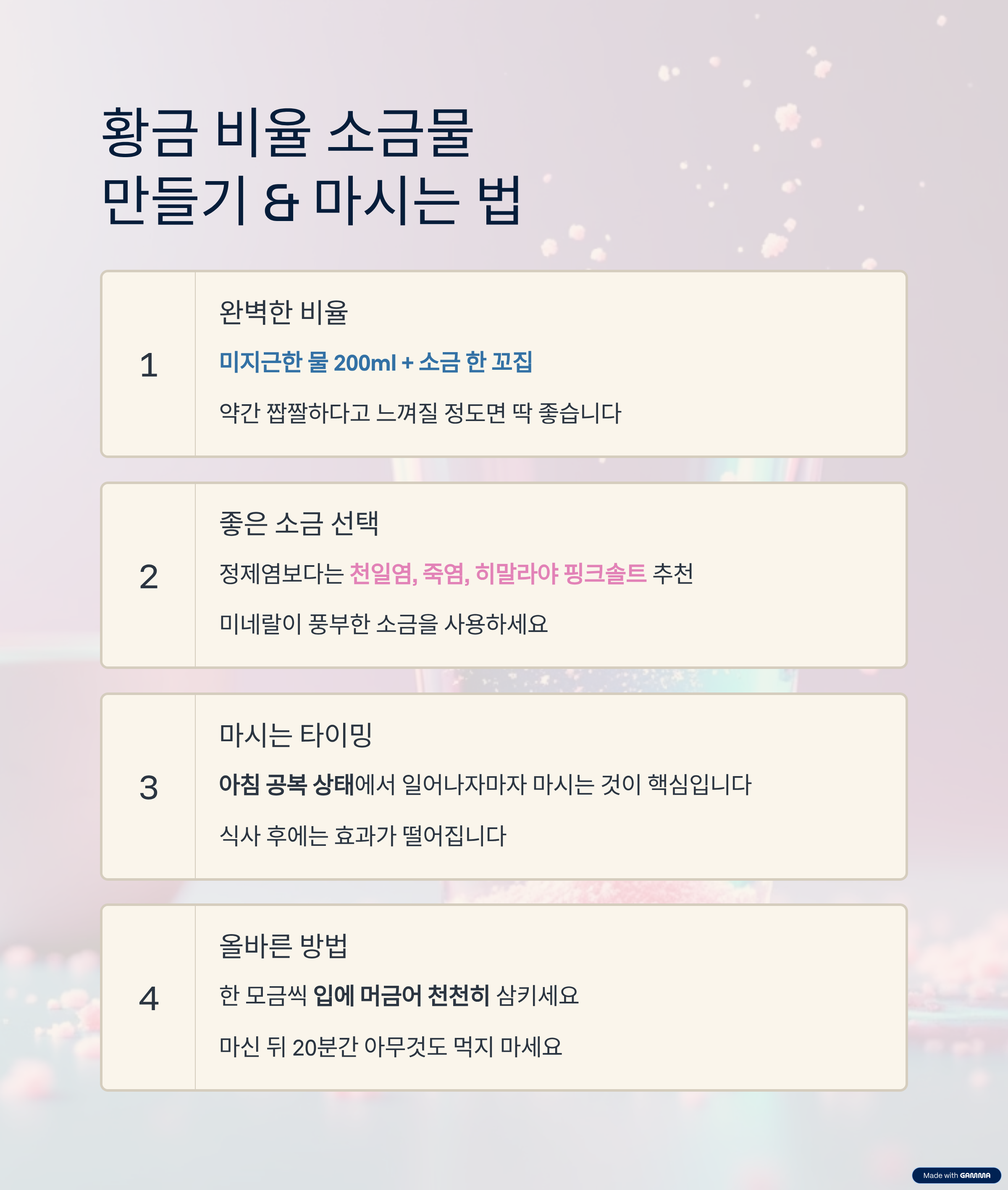 따뜻한 아침 햇살과 함께 소금물 한 잔으로 하루를 시작해보세요.