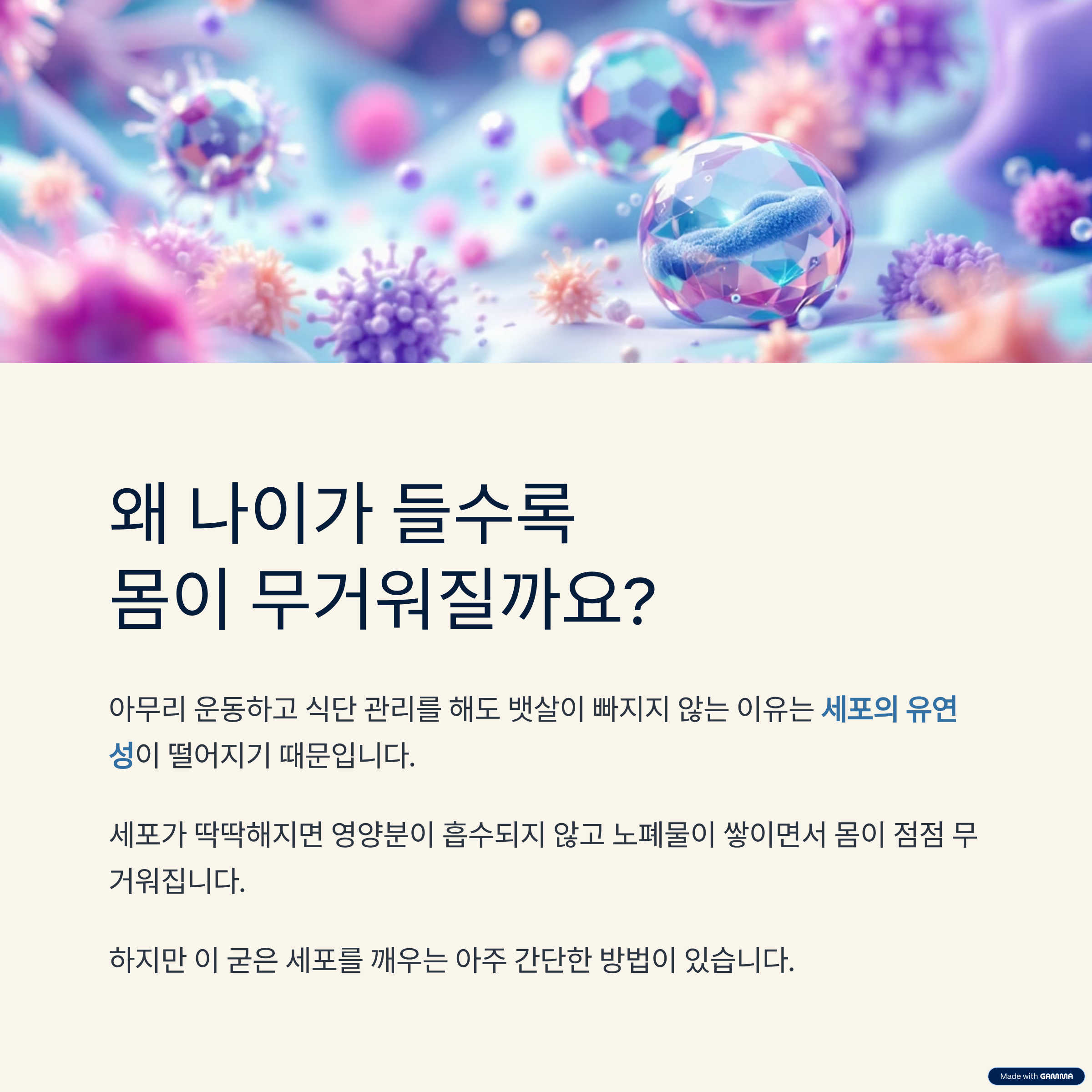 세포가 딱딱해지면 영양이 흡수되지 않고, 노폐물이 쌓이며 몸이 무거워지거든요.