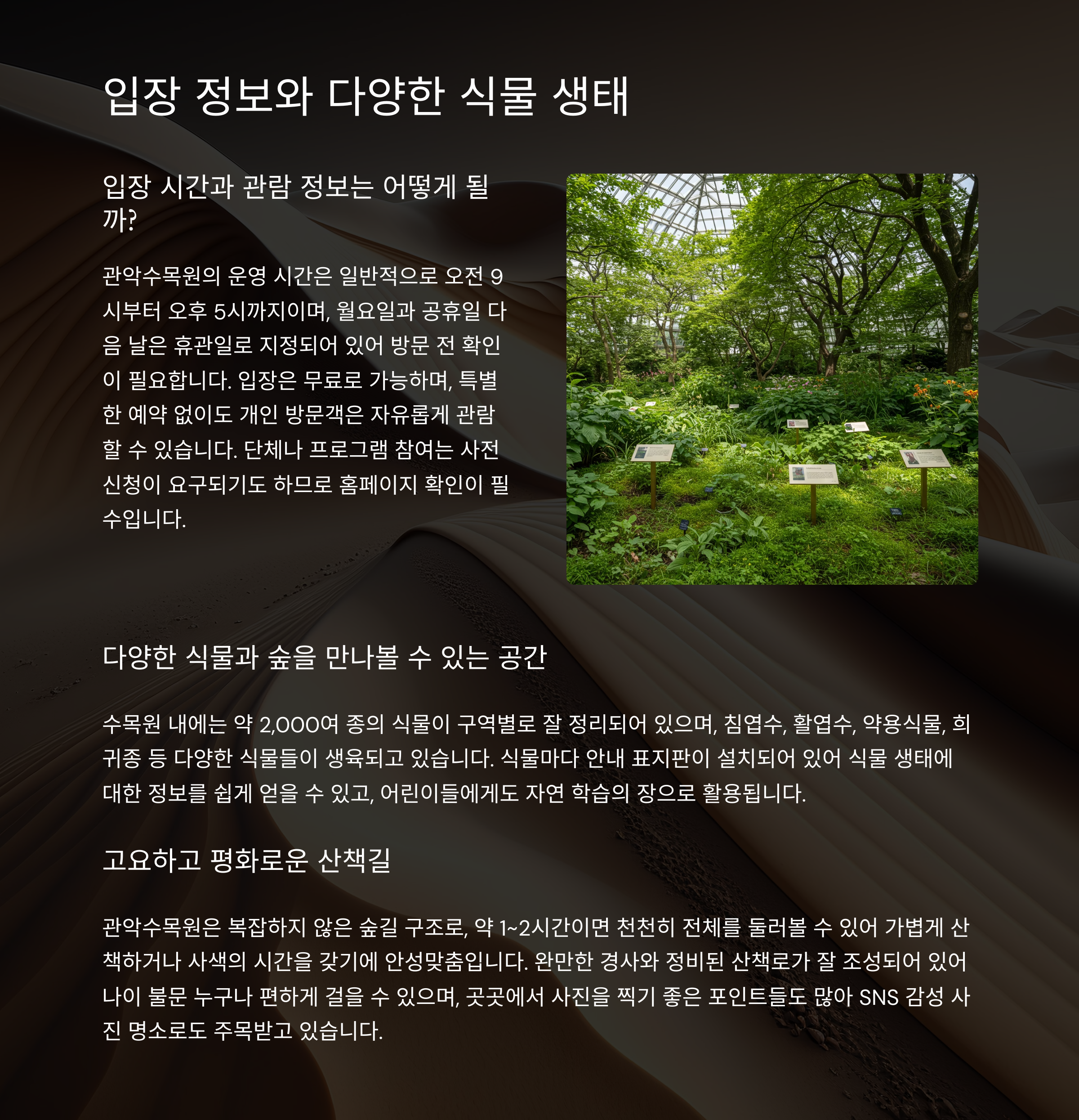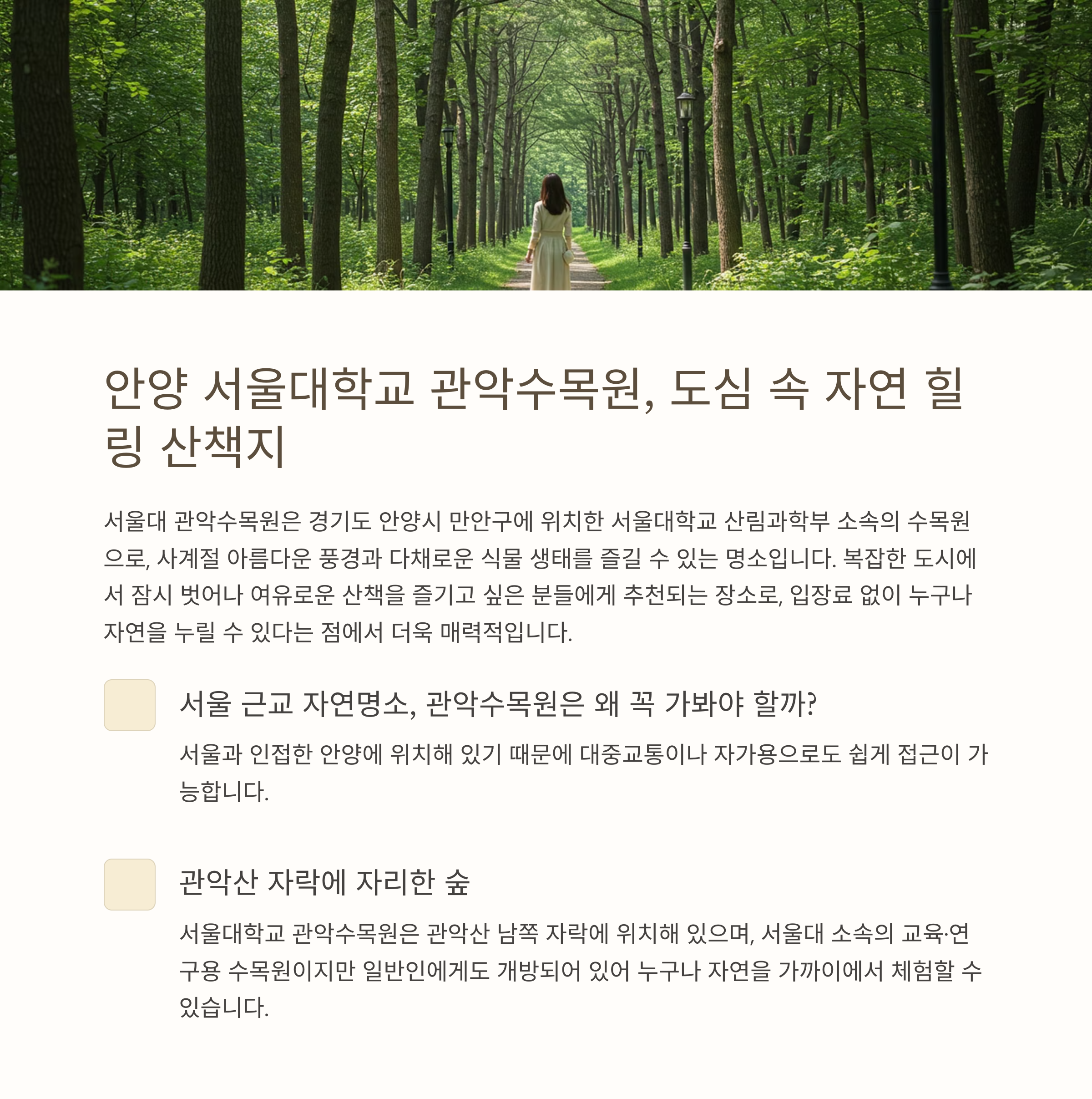 서울대 관악수목원은 경기도 안양시 만안구에 위치한 서울대학교 산림과학부 소속의 수목원으로, 사계절 아름다운 풍경과 다채로운 식물 생태를 즐길 수 있는 명소입니다. 복잡한 도시에서 잠시 벗어나 여유로운 산책을 즐기고 싶은 분들에게 추천되는 장소로, 입장료 없이 누구나 자연을 누릴 수 있다는 점에서 더욱 매력적입니다. 이번 글에서는 관악수목원의 위치, 입장 정보, 산책로, 계절별 특징 등을 꼼꼼히 소개해드리겠습니다.