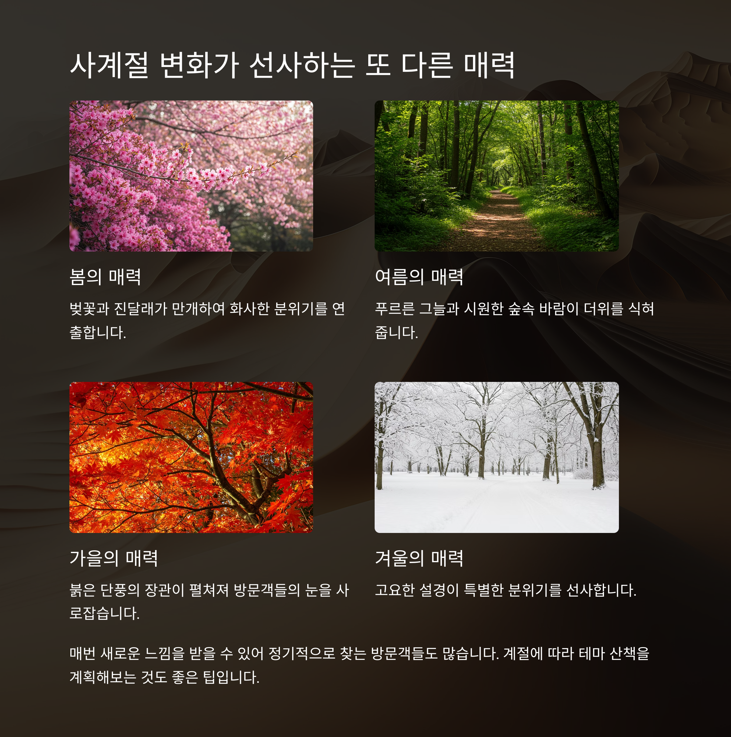 정기적으로 찾는 방문객들도 많습니다. 계절에 따라 테마 산책을