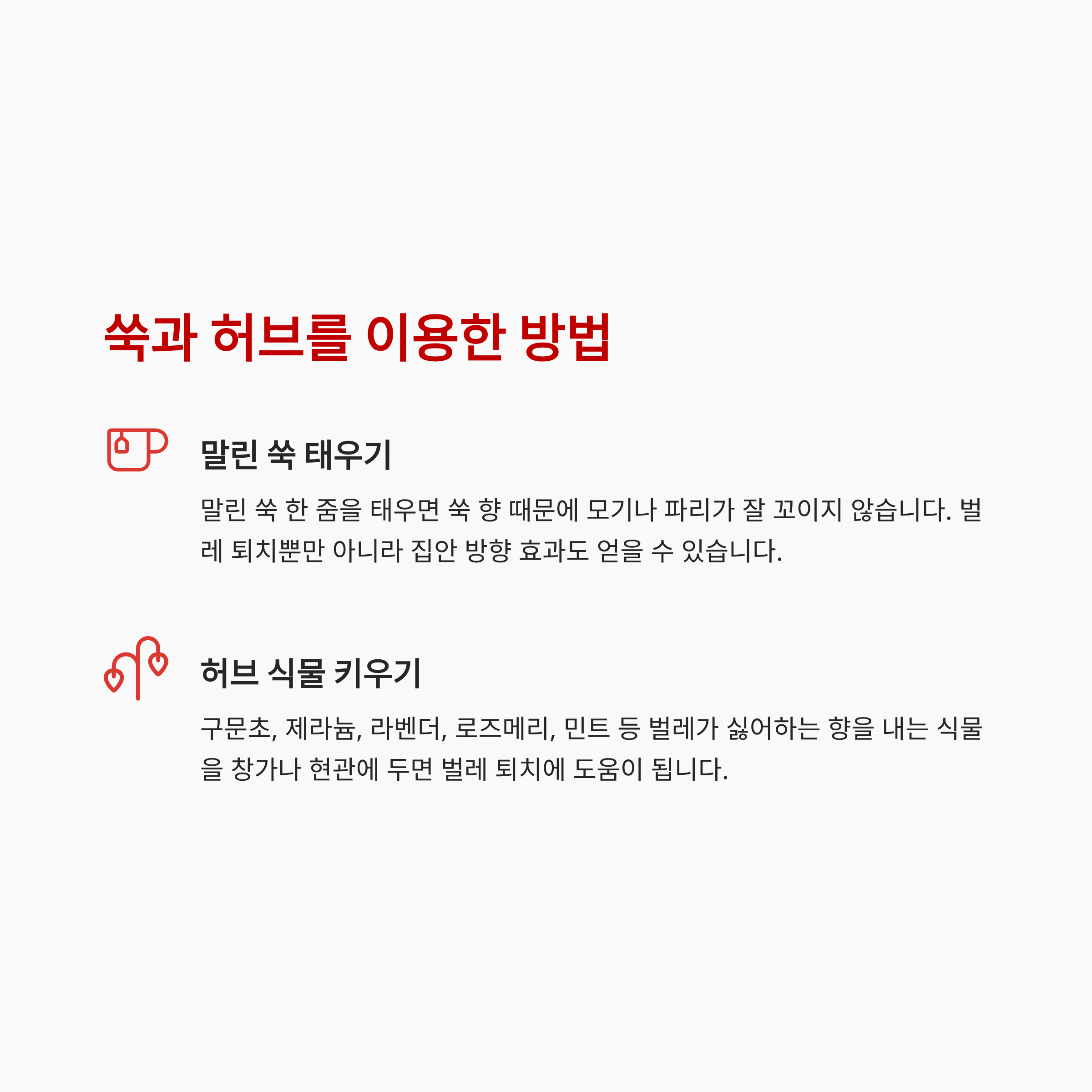 - 말린 쑥 태우기: 말린 쑥 한 줌을 태우면 쑥 향 때문에 모기나 파리가 잘 꼬이지 않습니다.