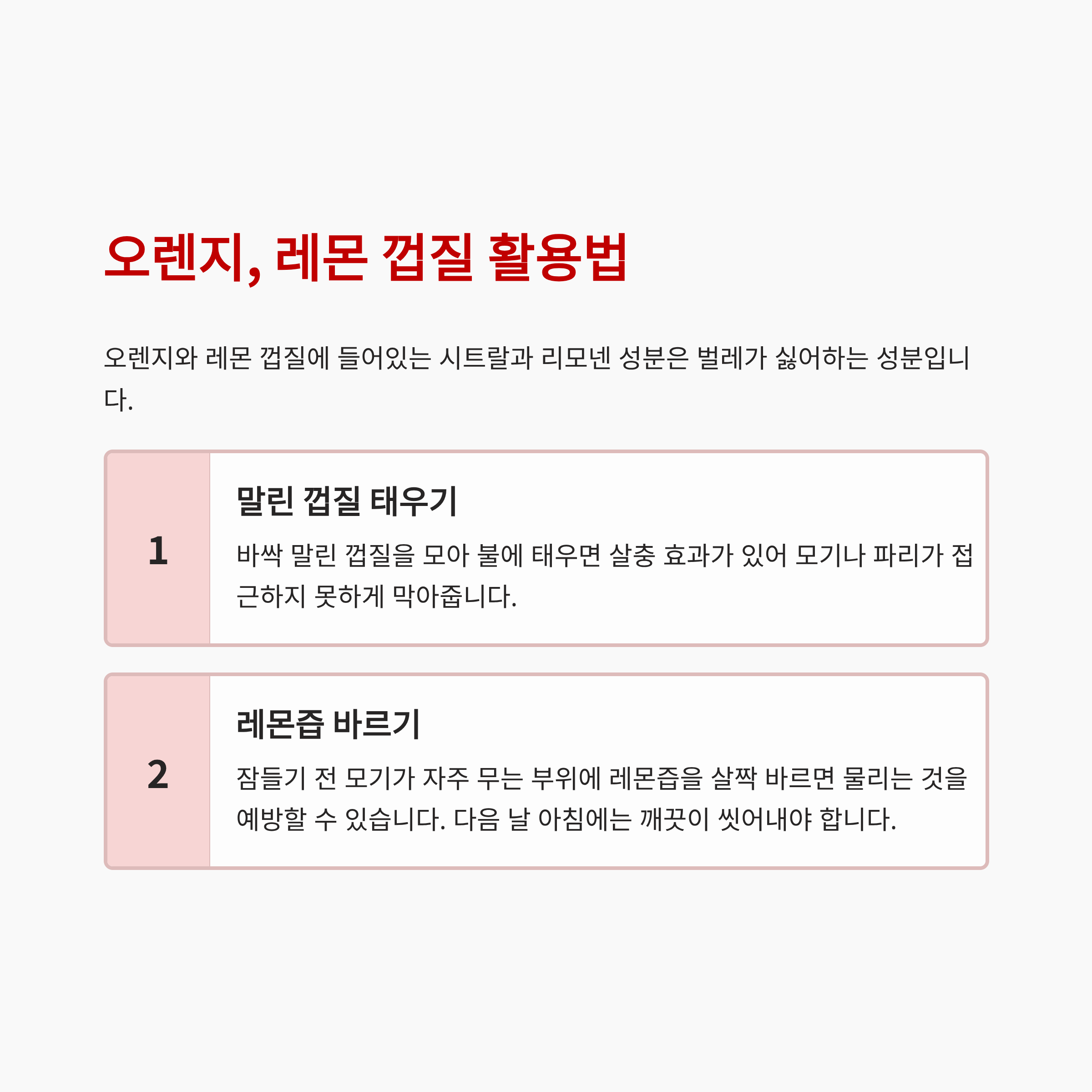 - 말린 껍질 태우기: 오렌지와 레몬 껍질에 들어있는 시트랄과 리모넨 성분은