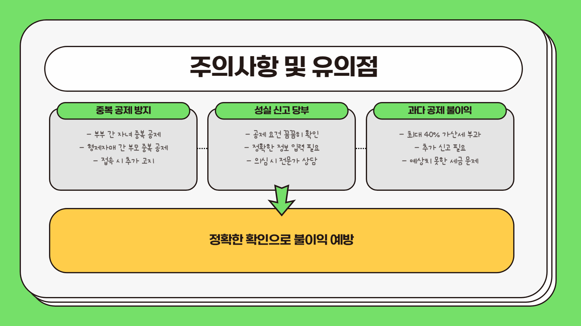 또한, 시스템으로 예방이 어려운 중복 공제와 같은 주의사항도 안내됩니다. 예를 들어, 부부가 자녀를 중복 공제하거나 형제·자매가 부모를 중복 공제하는 등의 실수를 방지하기 위해 간소화 서비스 접속 시 한 번 더 고지해요. 국세청은 실수 혹은 고의로 과다 공제하는 경우 예상치 못한 세금 문제가 발생할 수 있으므로, 연말정산 시 공제 요건을 꼼꼼하게 확인하고 성실하게 신고할 것을 당부했여요.