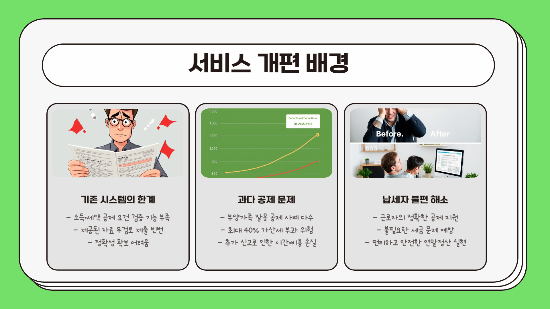 기존의 시스템에서는 소득 및 세액 공제 요건을 검증하는 기능이 부족하여, 제공된 자료를 검토 없이 제출하는 경우가 많았습니다. 이로 인해 납세자들은 불필요한 세금 문제에 직면할 수 있었고, 이러한 문제를 예방하기 위해 국세청은 새로운 시스템을 도입하게 되었어요.