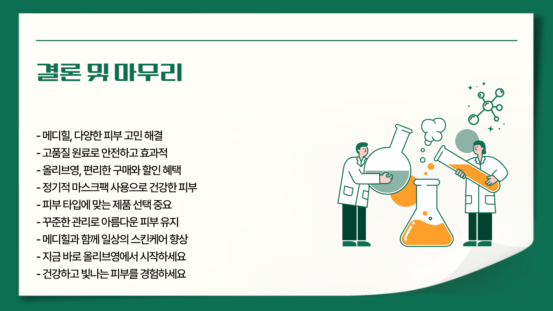 피부는 우리의 첫인상을 좌우하는 중요한 요소입니다. 따라서 정기적인 스킨케어와 함께 메디힐 마스크팩을 활용하여 피부를 케어하는 것이 중요합니다. 지금 바로 올리브영에서 메디힐 마스크팩을 구매하고, 건강하고 빛나는 피부를 경험해 보세요!