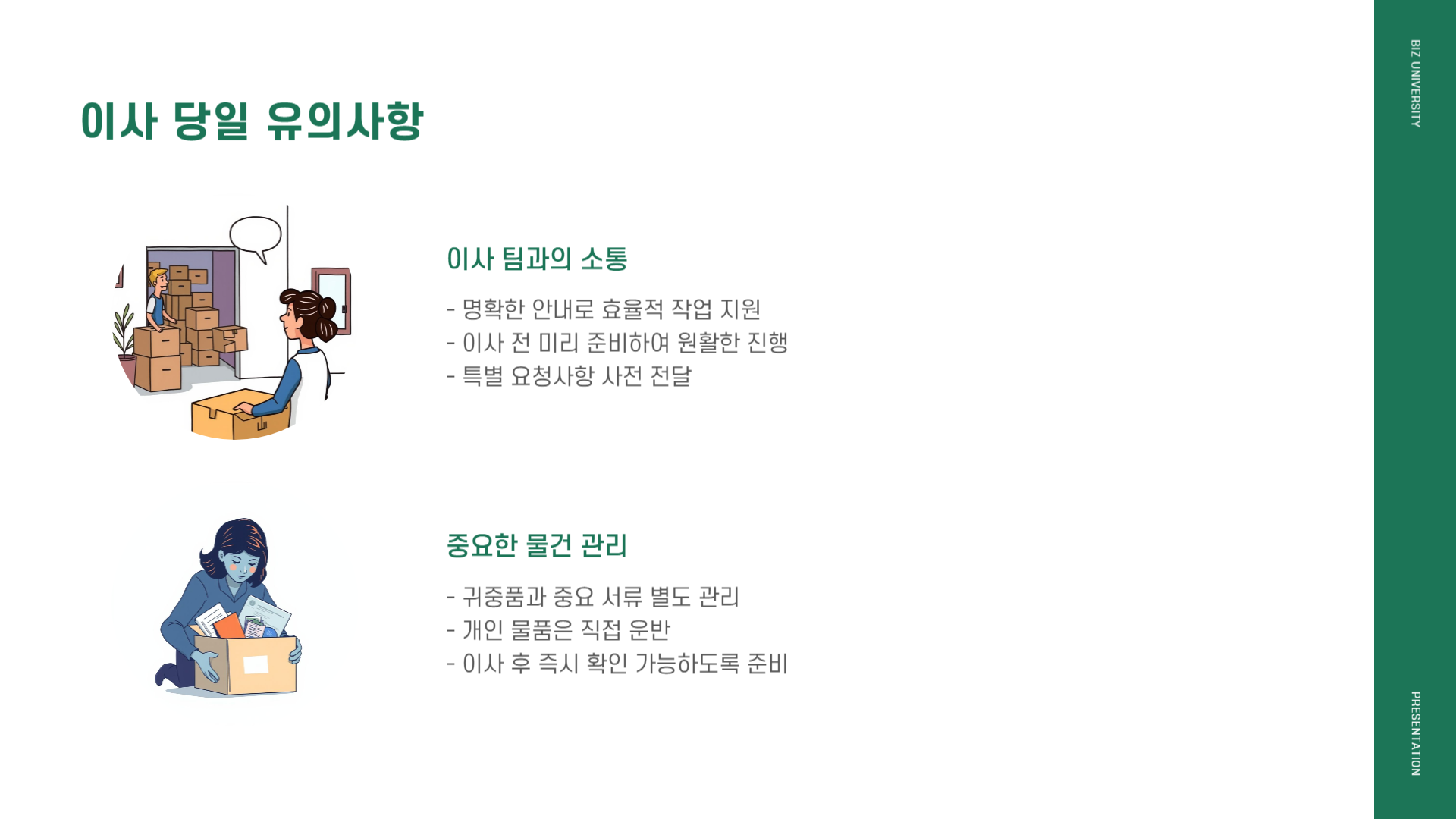 귀중품, 중요한 서류 및 개인 물품은 따로 챙겨 관리하는 것이 좋습니다. 이사 과정에서 분실되지 않도록 주의가 필요합니다. 중요한 물건은 별도의 가방이나 박스에 보관하고, 이사 후 바로 확인할 수 있도록 준비해 두세요.