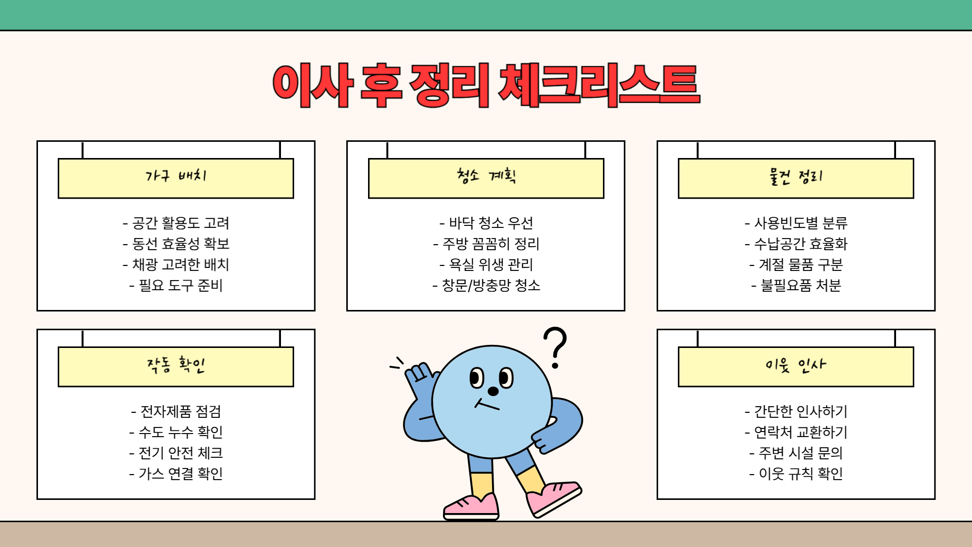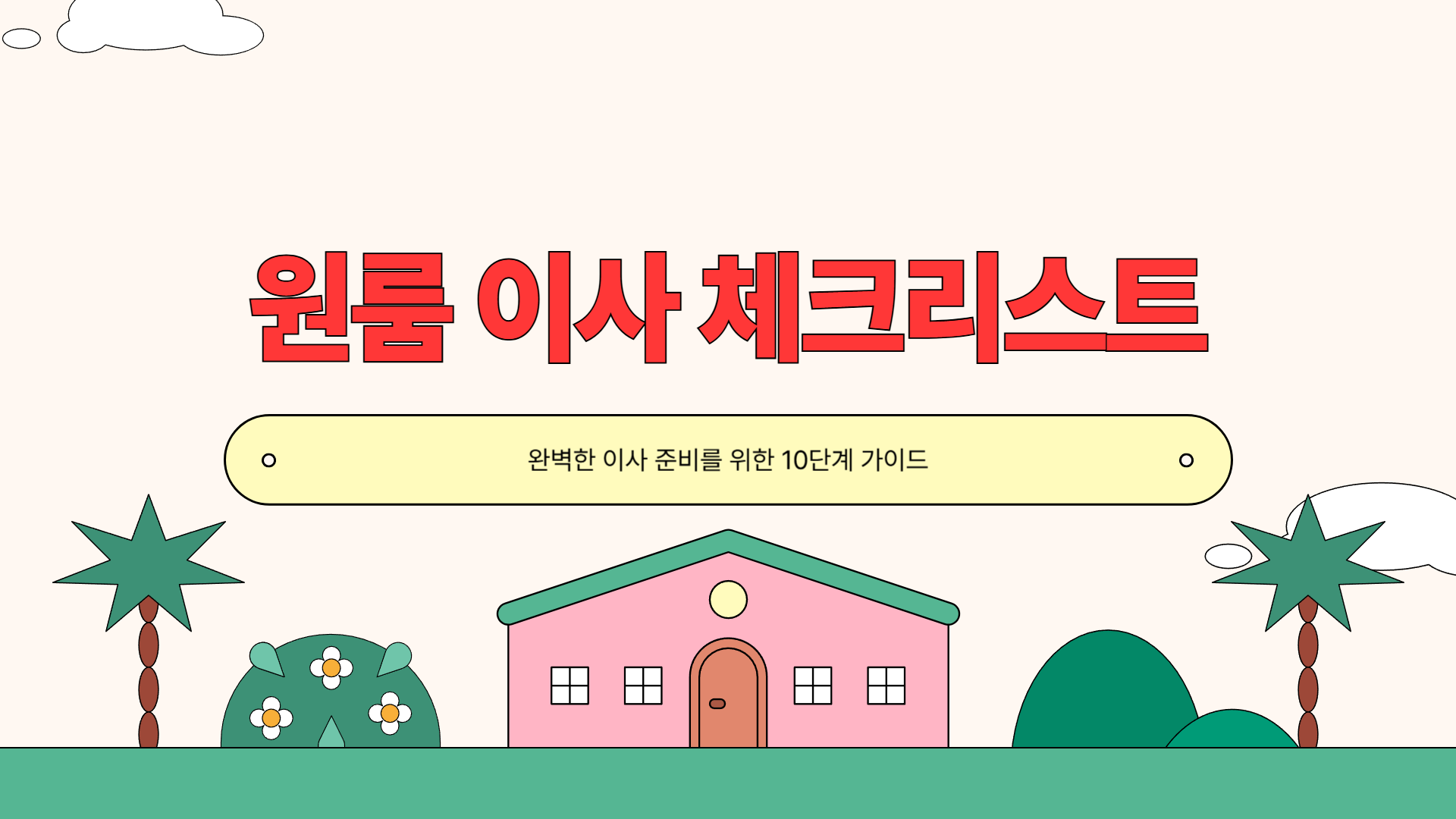 이 체크리스트를 참고하여 철저히 준비하면 원룸 이사를 더 수월하게 진행할 수 있습니다. 이사 준비가 잘 되길 바랍니다!