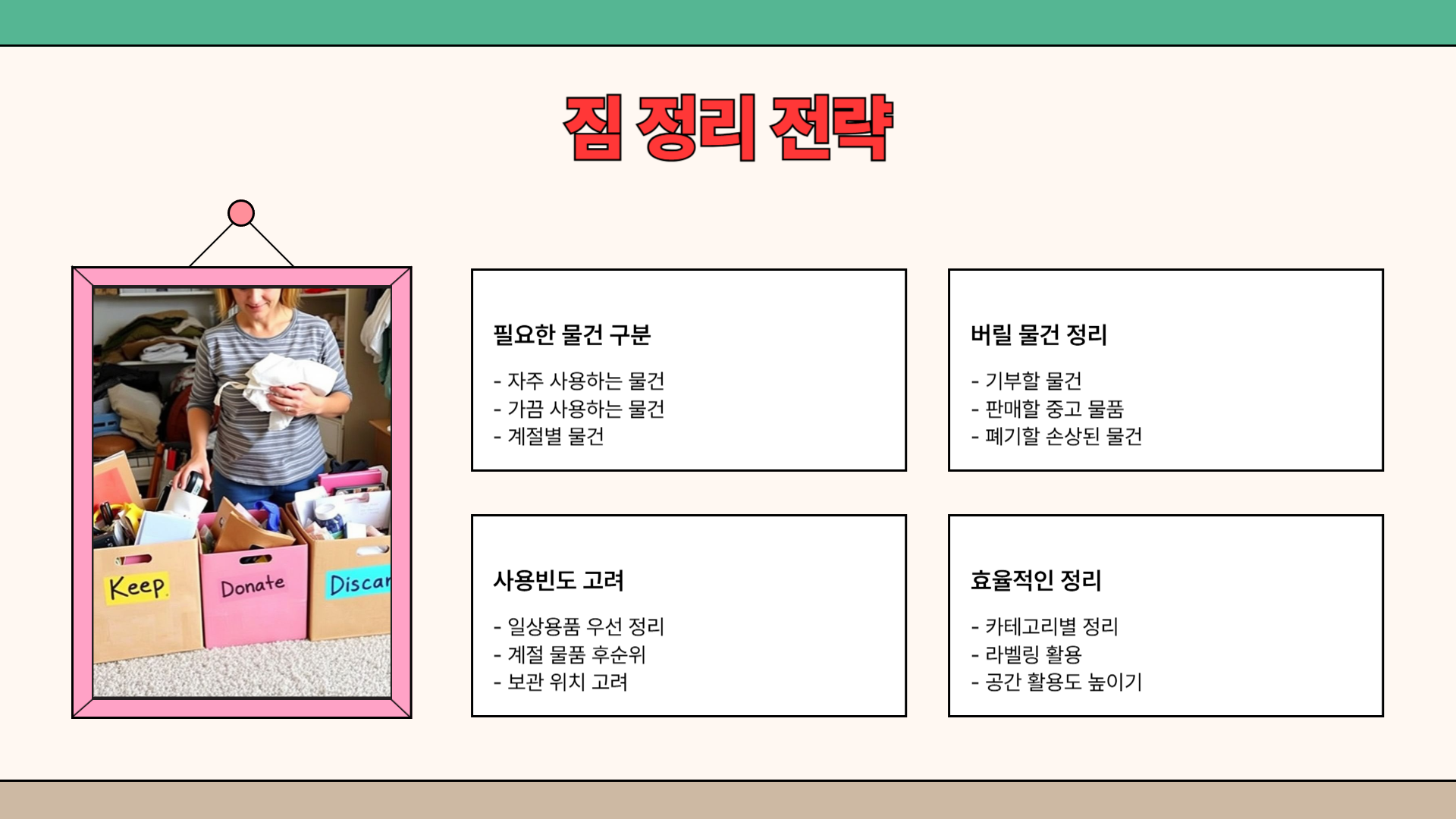 사용频도가 낮은 물건: 계절별 의류, 취미 용품 등은 먼저 포장합니다.