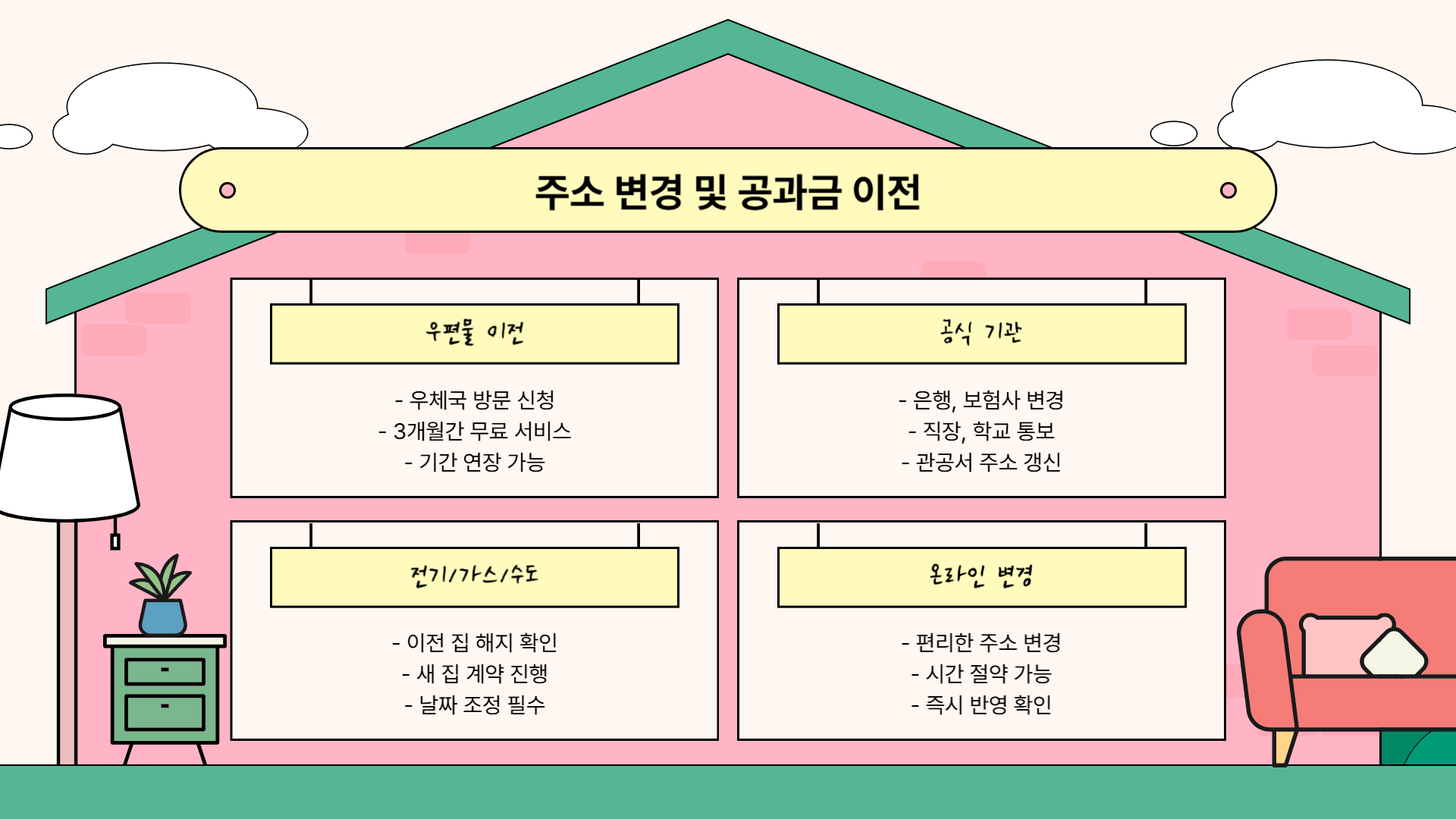 은행, 보험사, 직장, 학교 등 필요한 곳에 주소 변경을 알립니다.