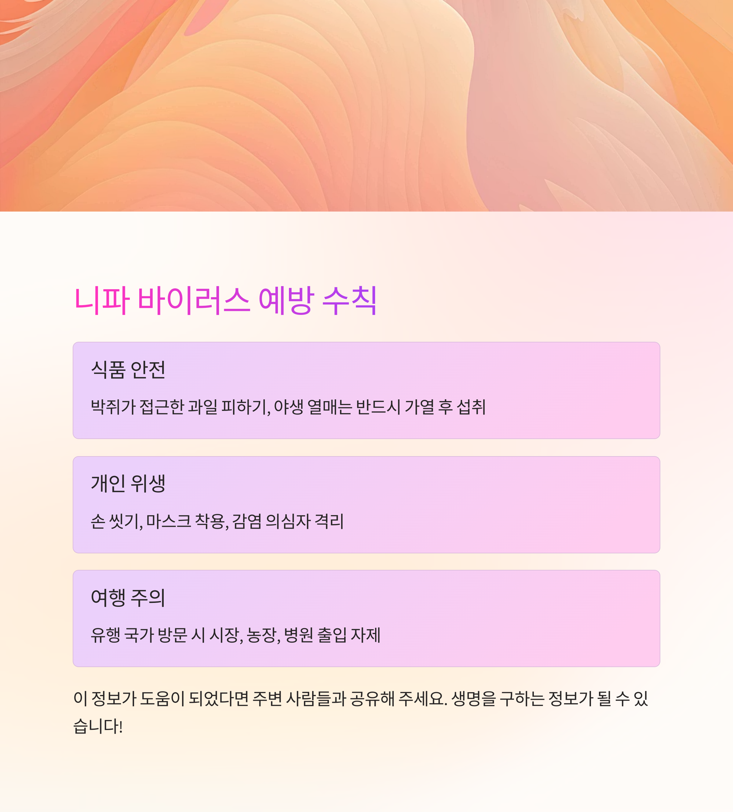 이 글에서는 니파 바이러스의 감염 경로, 주요 증상, 그리고 예방 수칙을 상세히 설명드립니다.
