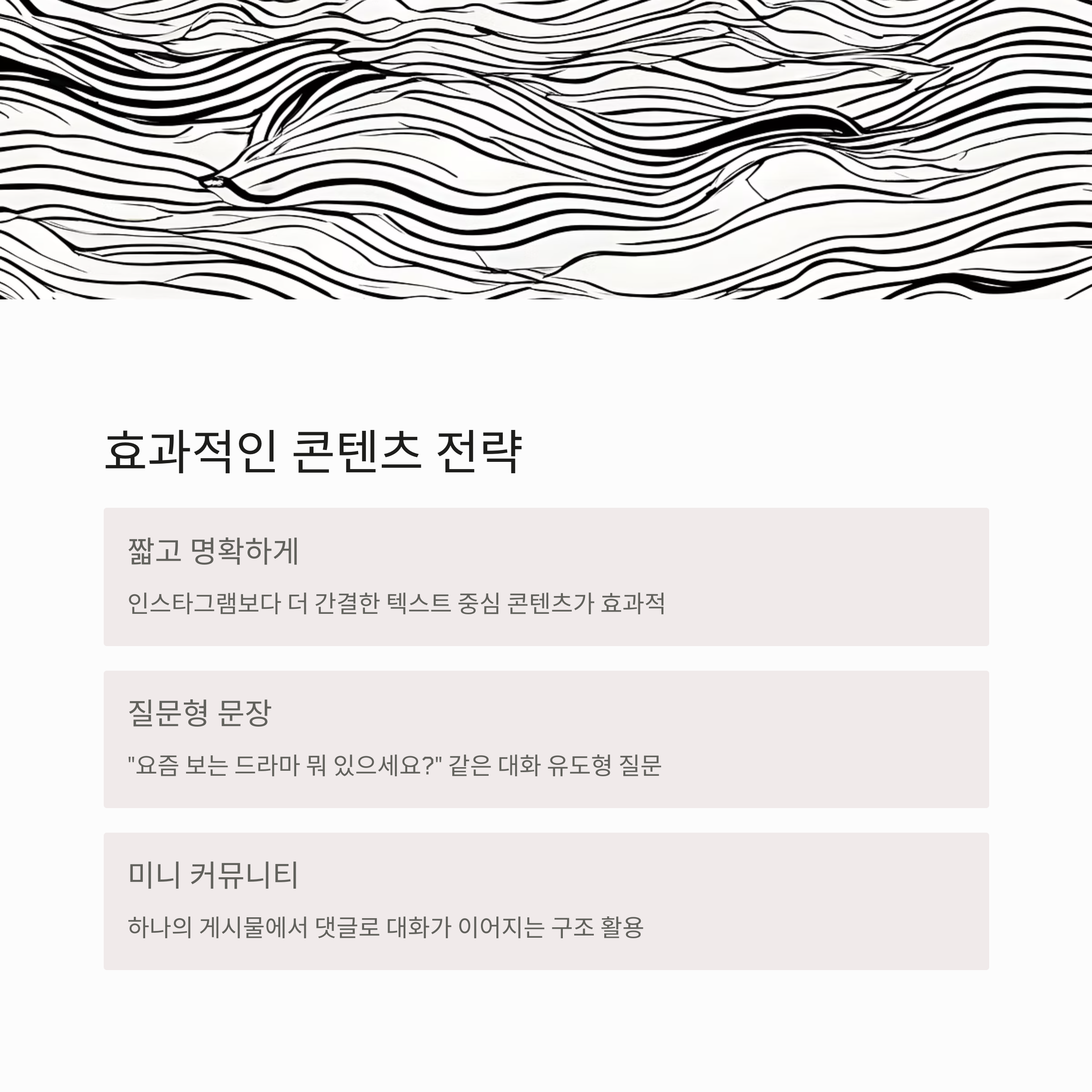스레드에서는 상업적 목적이 아닌 **"취미나 관심사 기반의 커뮤니티"**가 자연스럽게 만들어집니다.