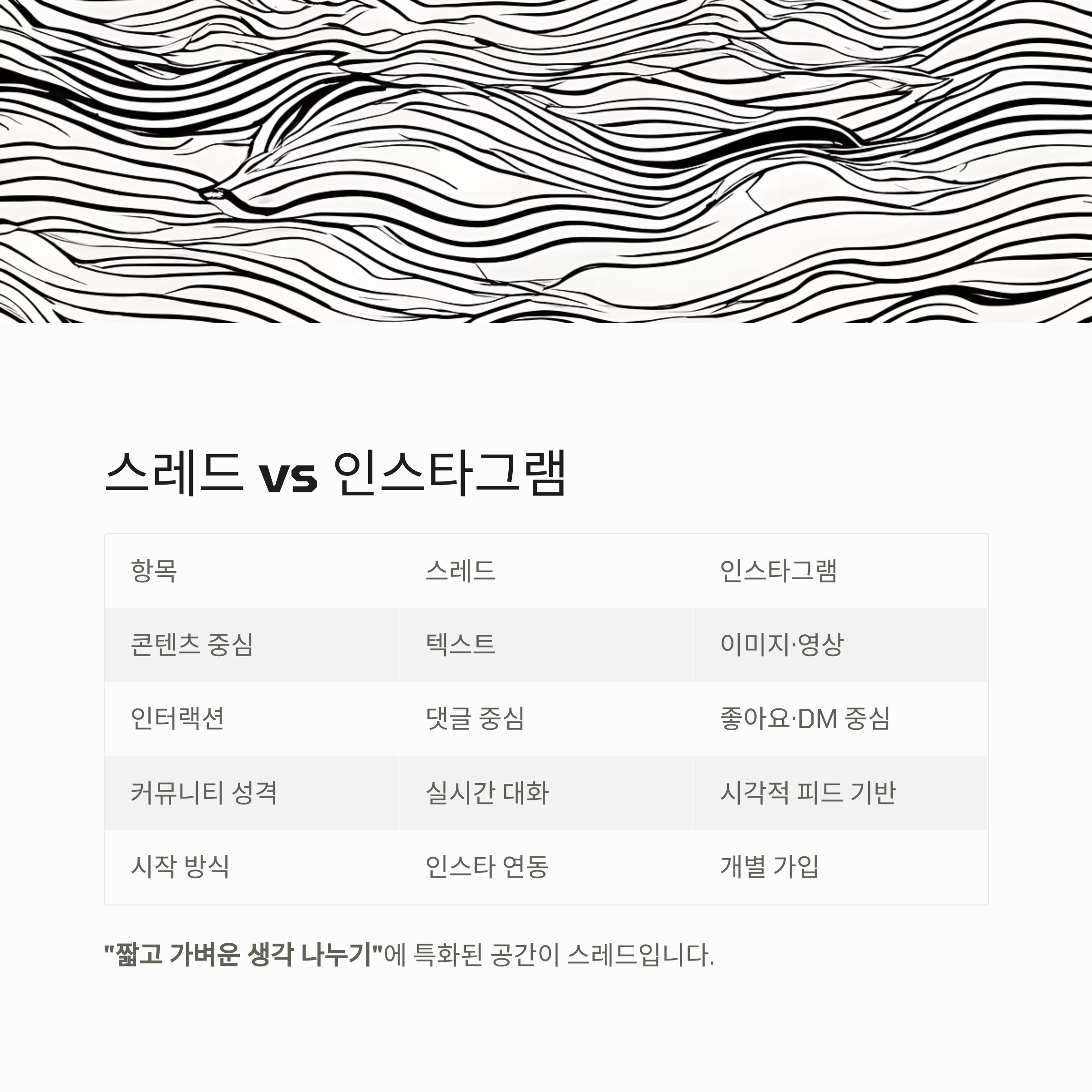 스레드는 인스타그램보다 더 짧고, 명확한 텍스트 중심 콘텐츠에 적합합니다.