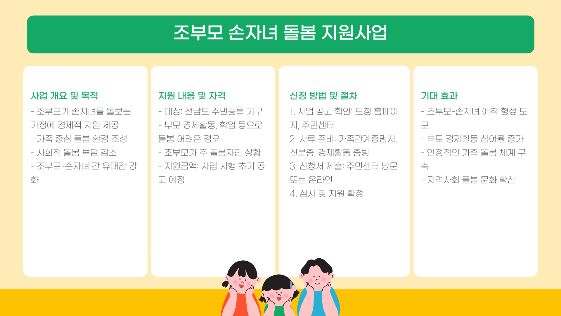 전남도는 저출생 문제를 해결하고 아이 키우기 좋은 환경을 조성하기 위해 다양한 돌봄 정책을 적극적으로 추진하고 있습니다. 대표적인 정책으로는 조부모 손자녀 돌봄 지원사업, 전남형 24시간 돌봄어린이집, 그리고 외국 국적 아동 보육료 지원 사업이 있습니다. 이 정책들은 부모와 조부모의 돌봄 부담을 덜고, 아이들이 안전하고 안정된 환경에서 성장할 수 있도록 돕는 데 중점을 두고 있습니다. 아래에서 각 정책의 세부 내용과 신청 방법을 자세히 안내해드립니다.
