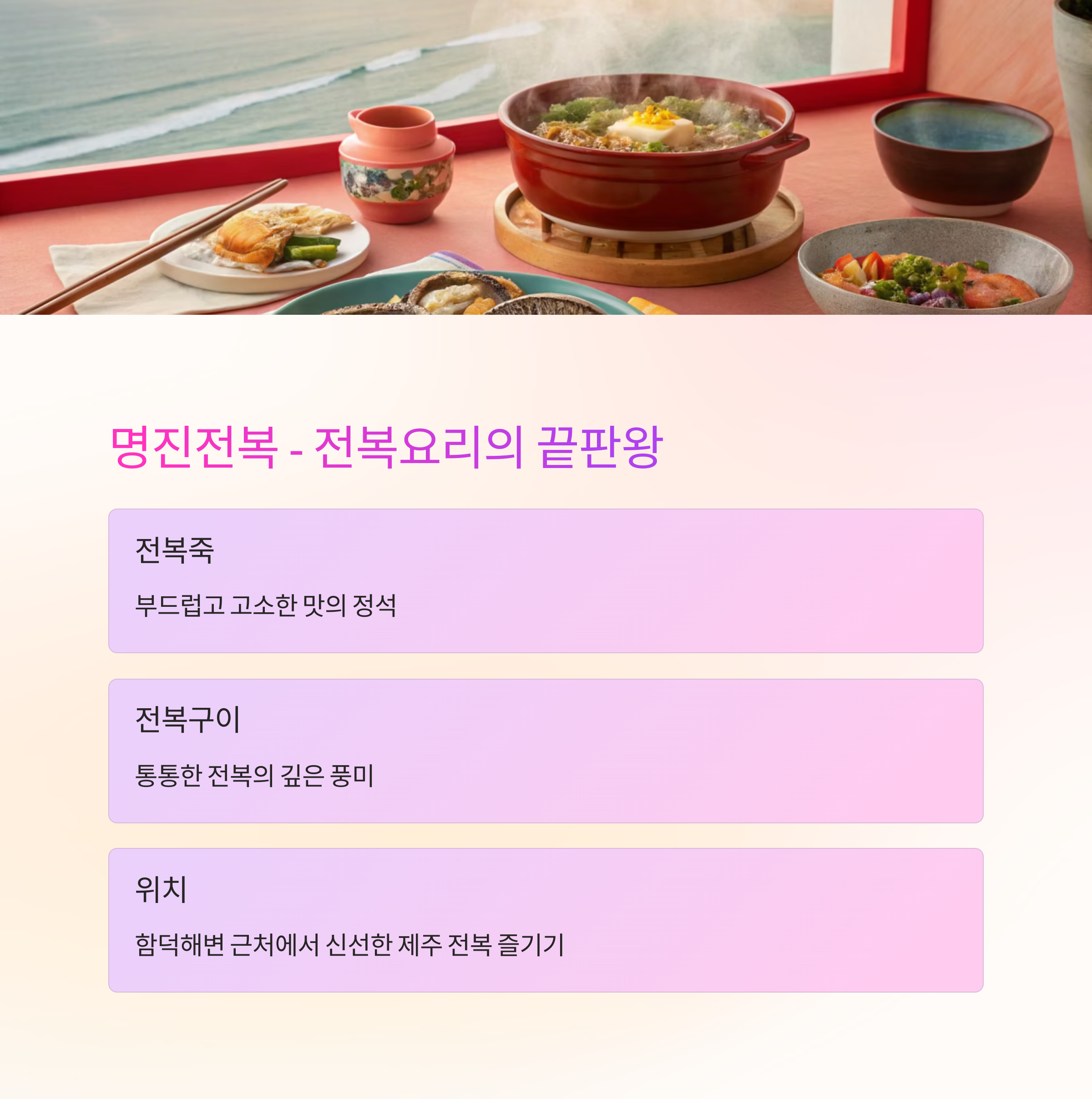- 신선한 제주 전복을 다채롭게 즐길 수 있어요.