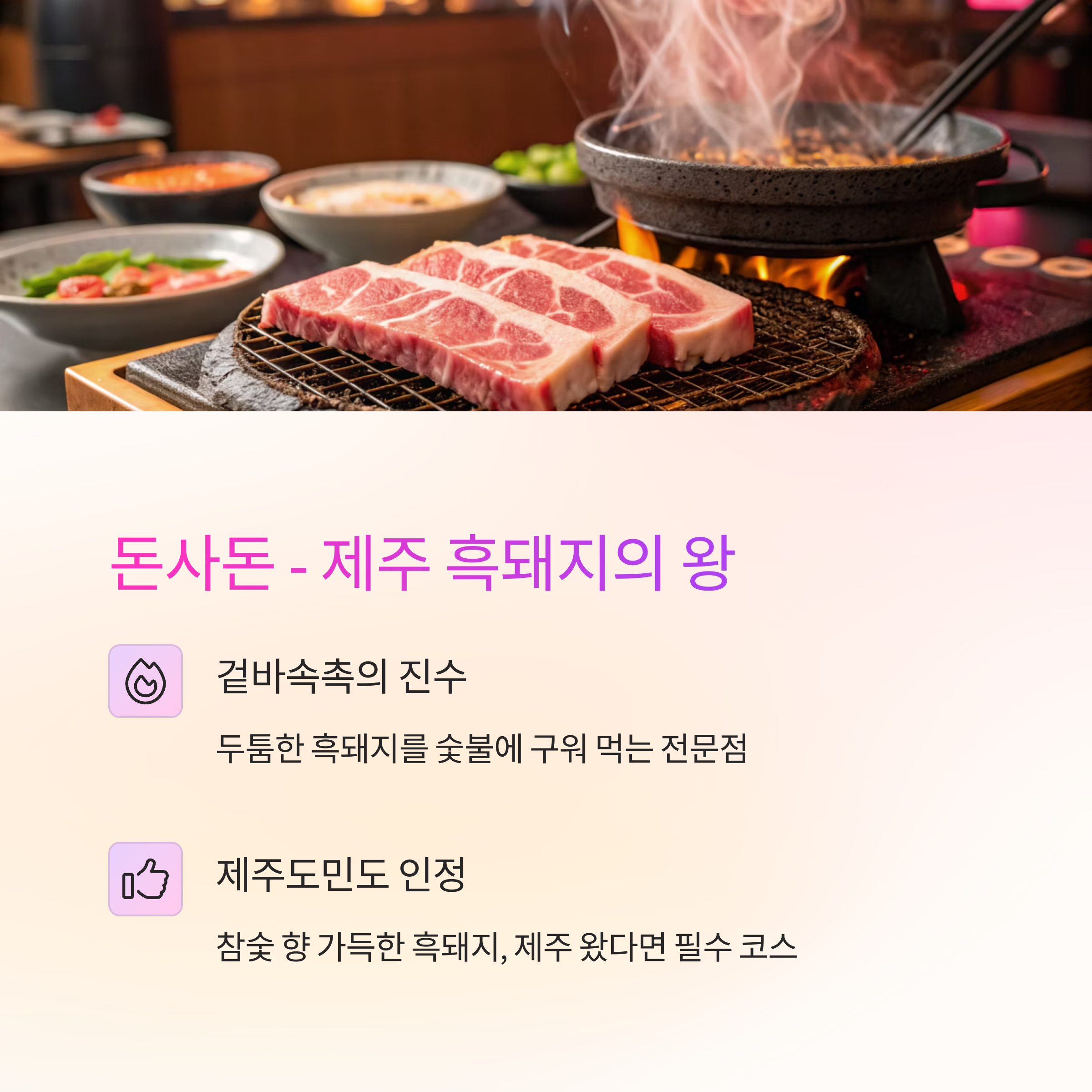 "참숯 향 가득한 흑돼지, 제주 왔다면 필수 코스입니다."