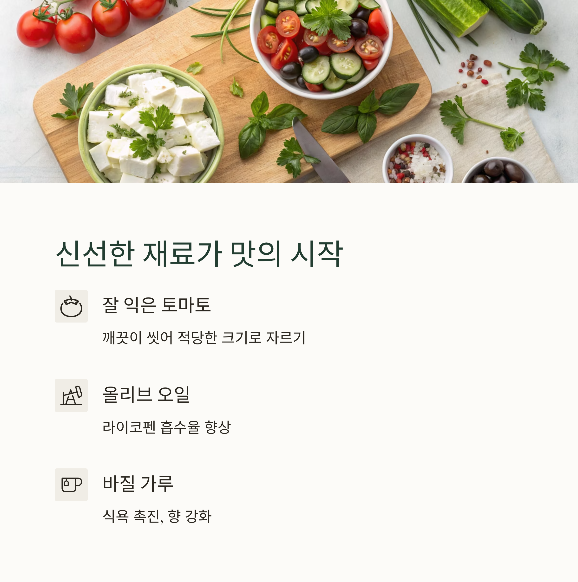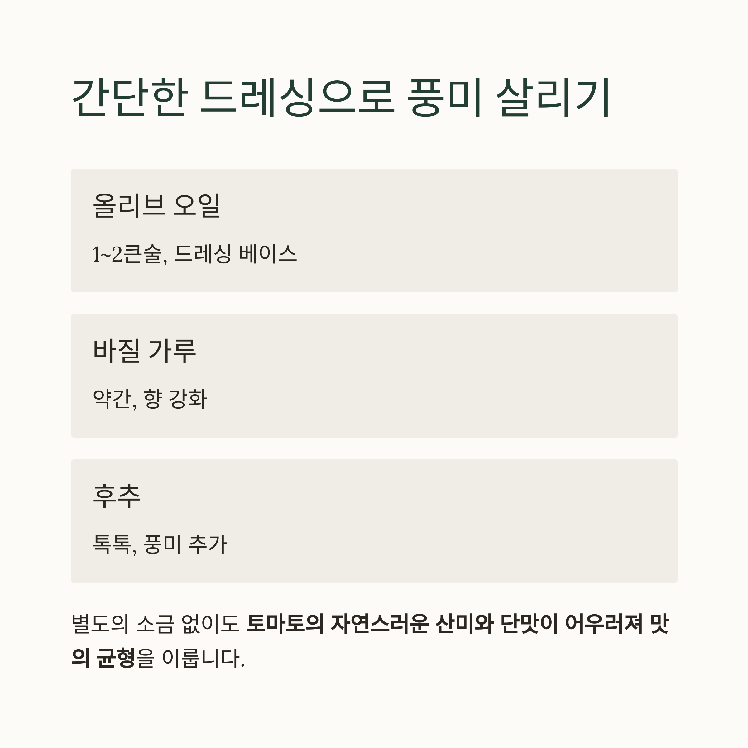 특히 바질, 후추, 올리브 오일의 조화는 토마토의 풍미를 끌어올리는 핵심 포인트입니다.