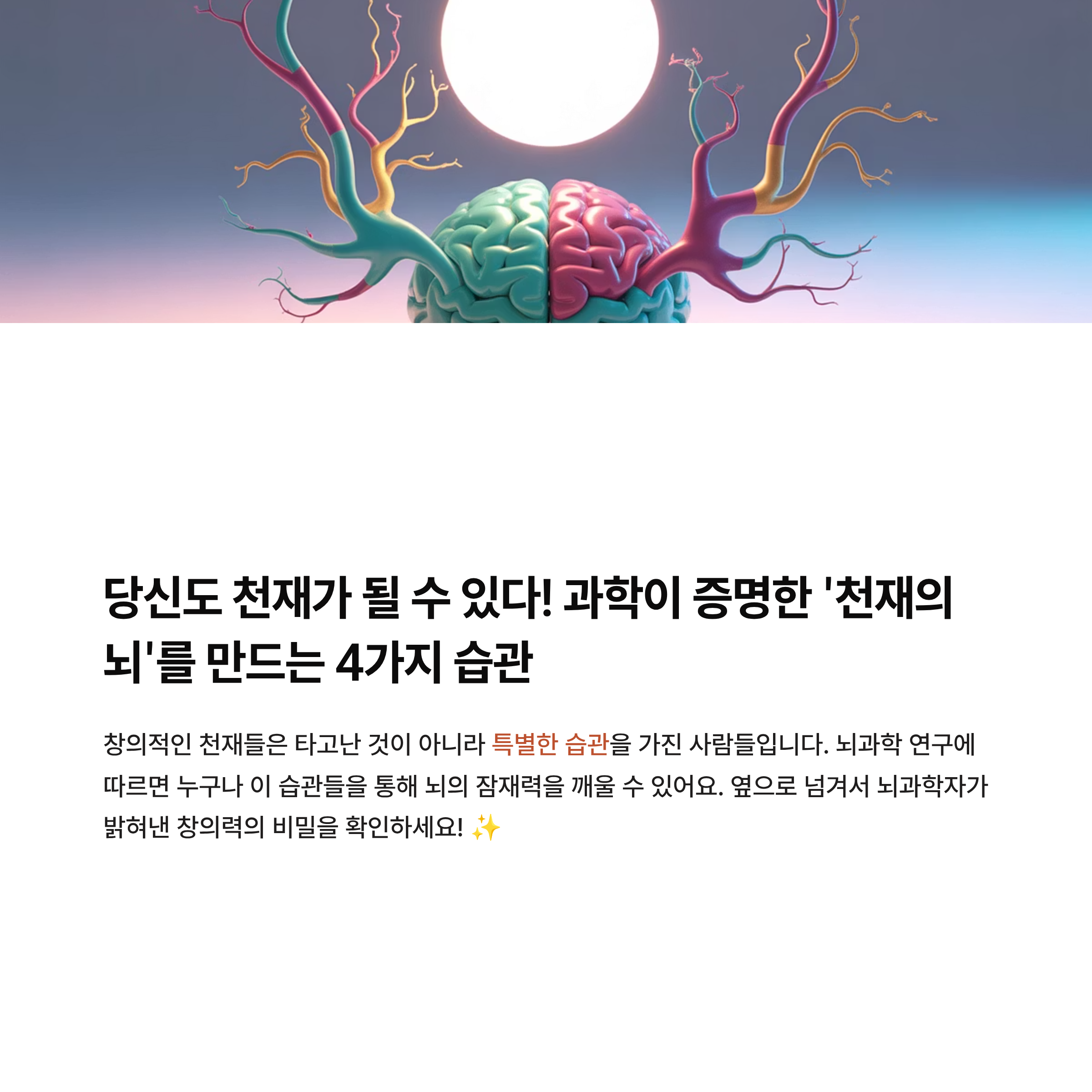 오늘부터 이 4가지 습관을 실천하며 당신의 뇌를 깨우고, 창의적인 삶을 시작해 보세요! 🤩