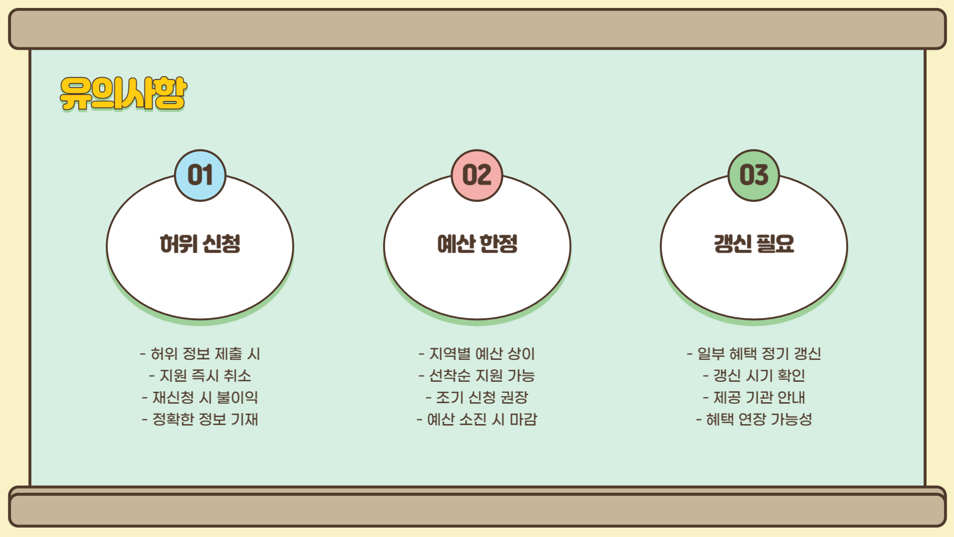 허위 신청 금지: 신청 과정에서 허위 정보 제출 시 지원이 취소되며, 추후 재신청에 불이익이 있을 수 있습니다.