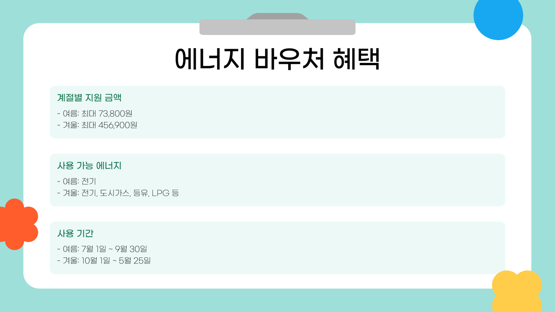 이 제도는 여름철 냉방비와 겨울철 난방비를 직접적으로 지원하며, 대상 가구는 필요한 에너지를 선택하여 혜택을 받을 수 있습니다.