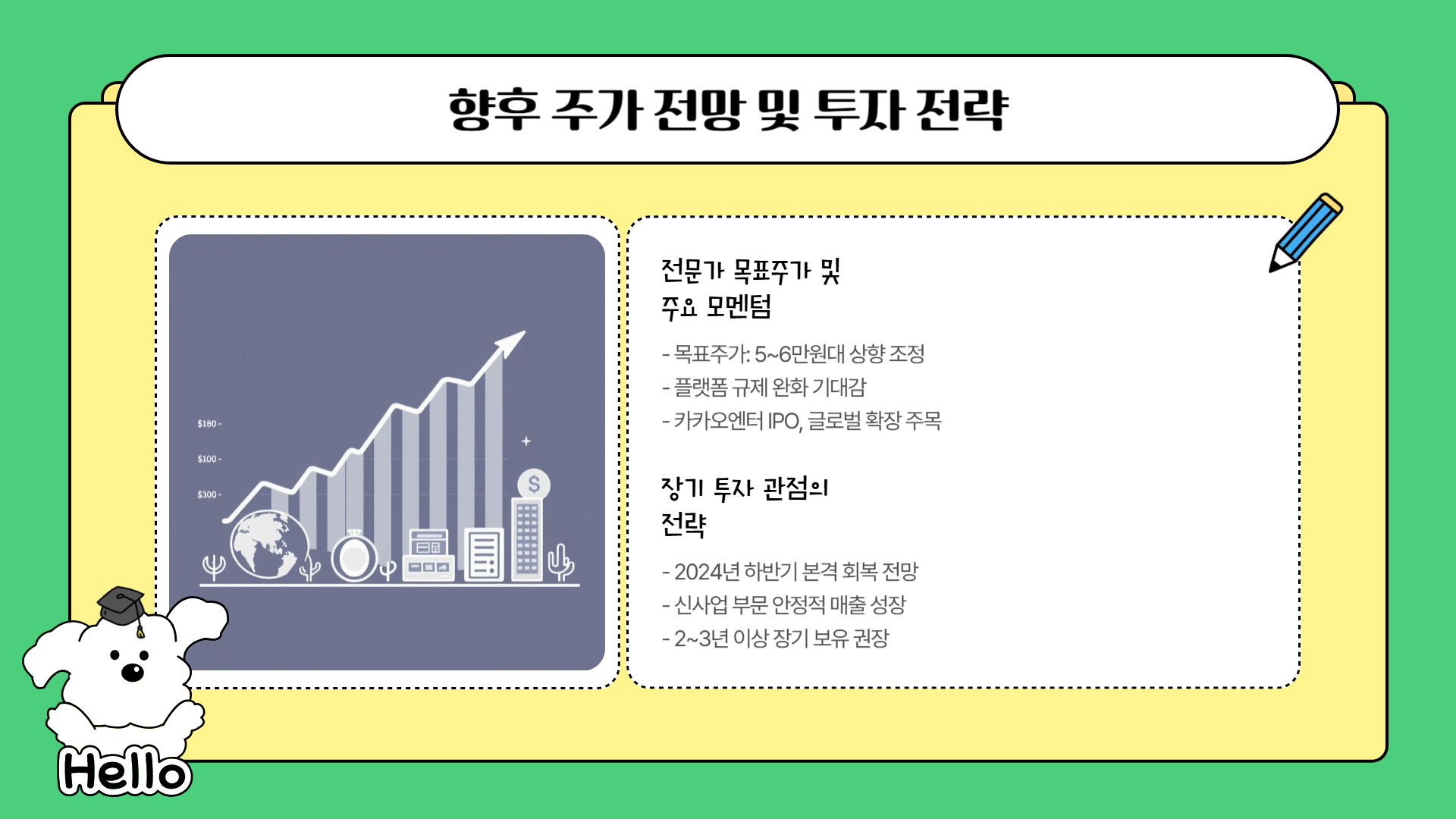 카카오에 대한 투자 전략은 장기적 관점에서 분할 매수를 권장하는 것이 주를 이루고 있다. 플랫폼 사업이 회복되기까지 시간이 필요할 수 있지만, 2~3년 이상 보유 시 안정적인 수익을 기대할 수 있다는 분석이다.
