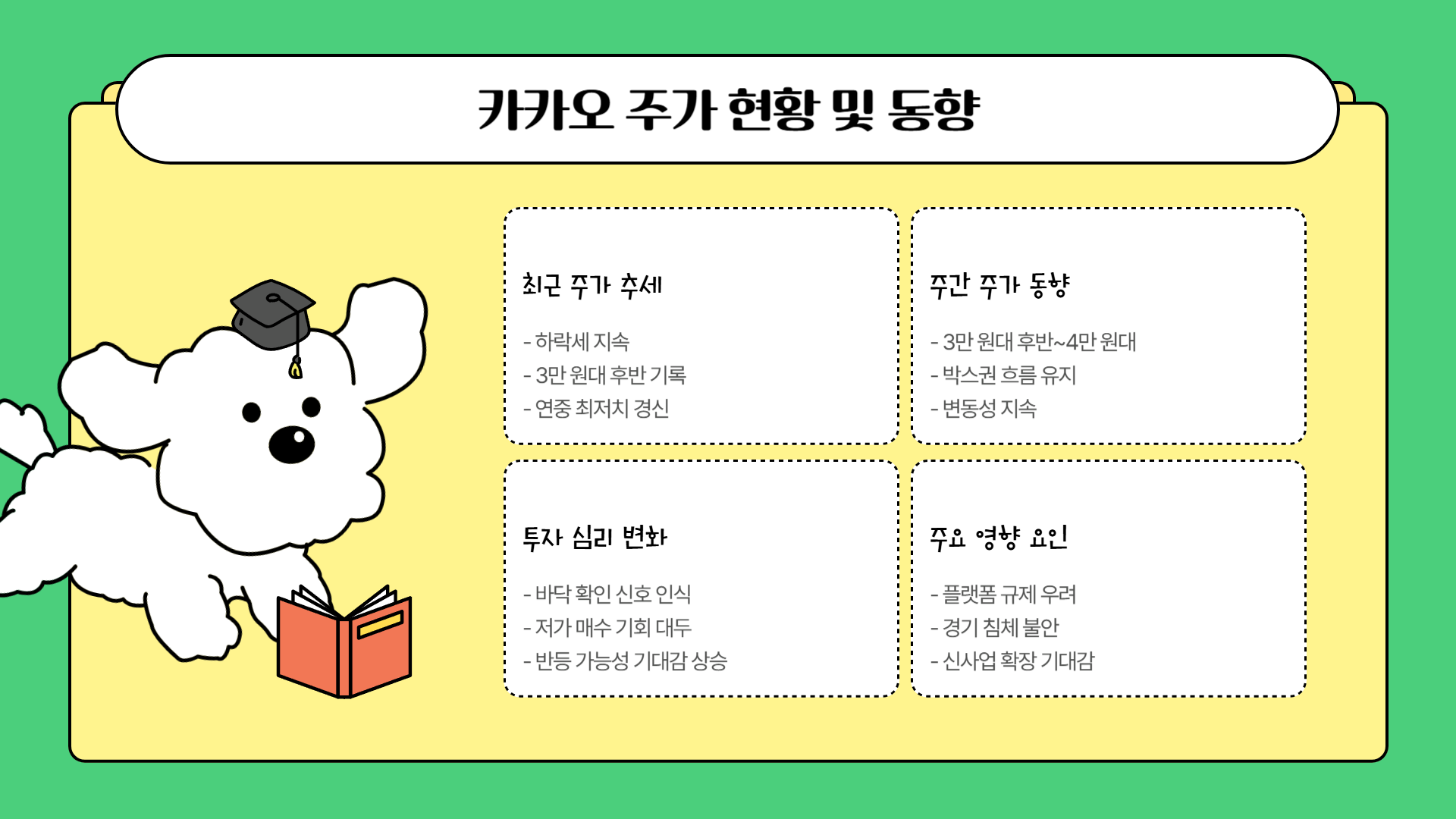 최근 카카오 주식이 하락세를 이어가며 투자자들의 이목을 집중시키고 있다. 2024년 초 기준, 연중 최저치를 기록하며 3만 원대 후반까지 떨어졌던 주가는 최근 플랫폼 규제 완화 기대감과 신사업 확장 소식으로 반등 가능성을 보이고 있다.