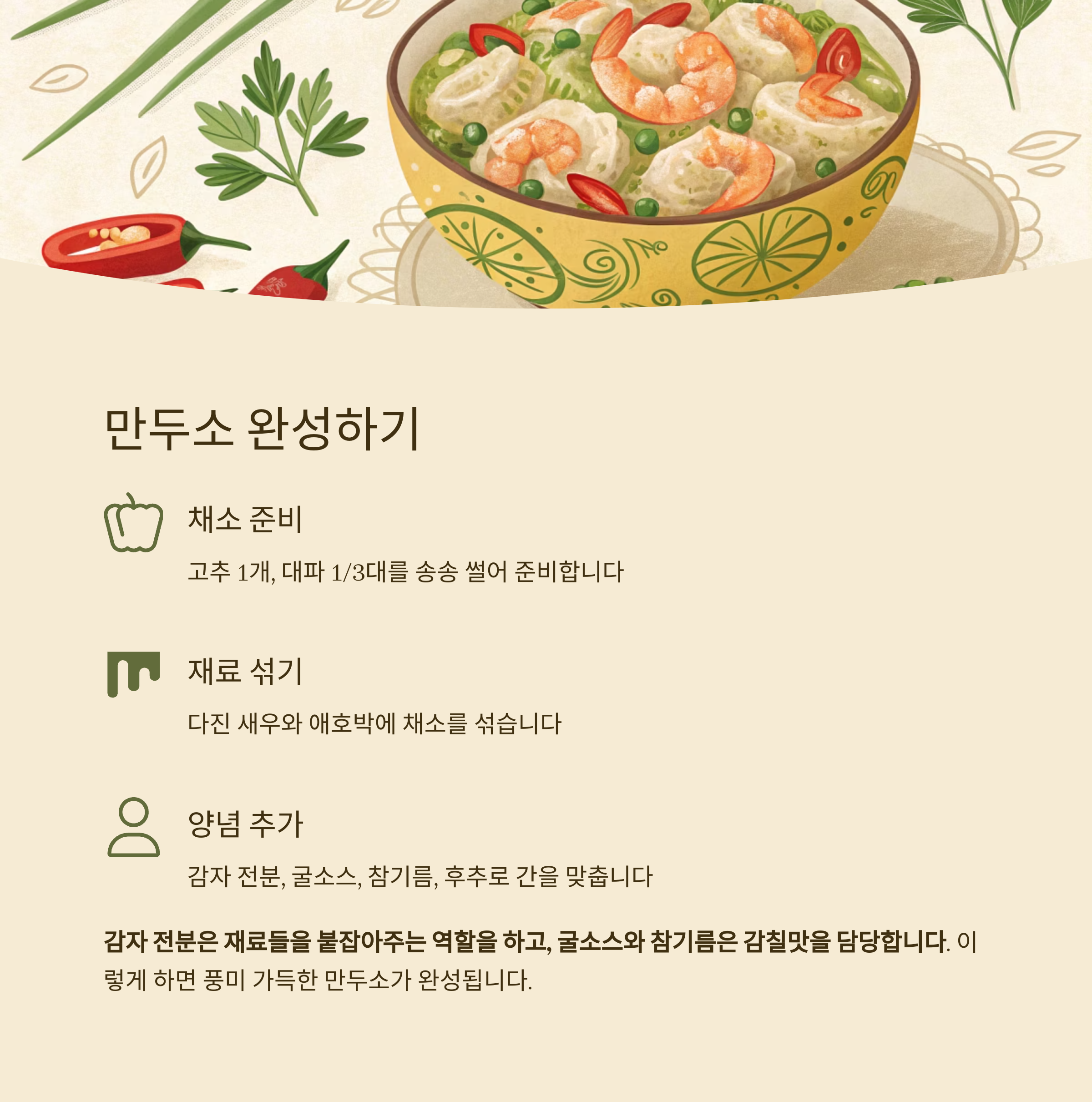 감자 전분, 굴소스, 참기름, 후추로 간을 맞춰 만두소를 완성합니다.